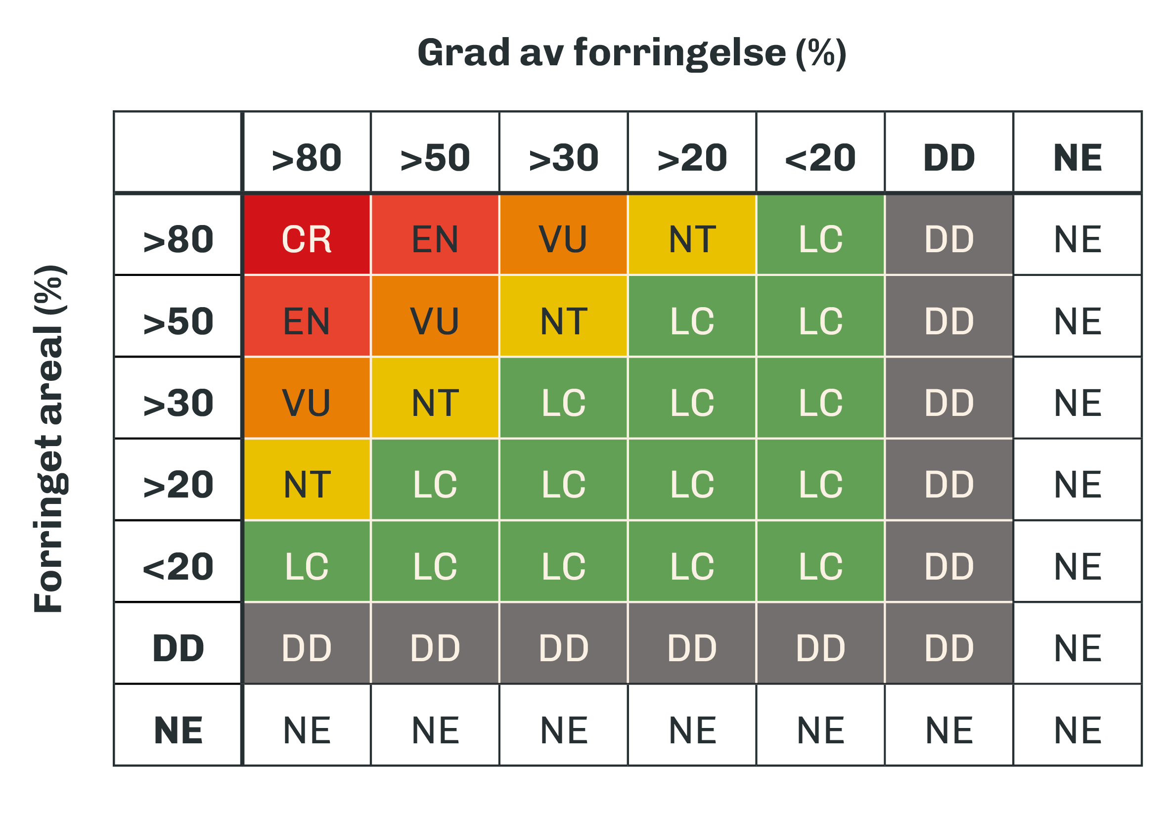 Hentet fra https://artsdatabanken.no/Naturtyper/Rodlista-naturtyper/Om-Rodlista/Kategorier-og-kriterier/Nasjonale-tilpasninger