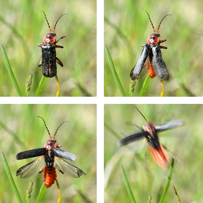 En bløtvinge (Cantharidae) åpner dekkvingene og folder ut flygevingene for å ta av.