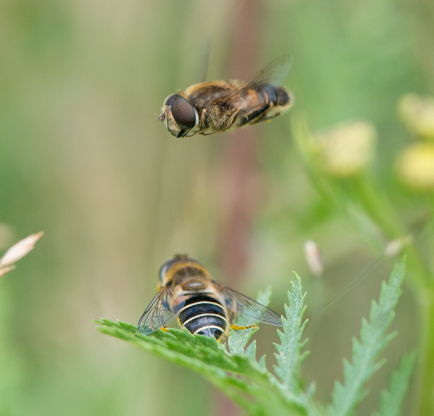 Blomsterfluene er suverene flygere og kan tilbringe timer i strekk i luften. Hannen hos engdroneflue kurtiserer hunnen ved å henge urørlig i luften over henne.