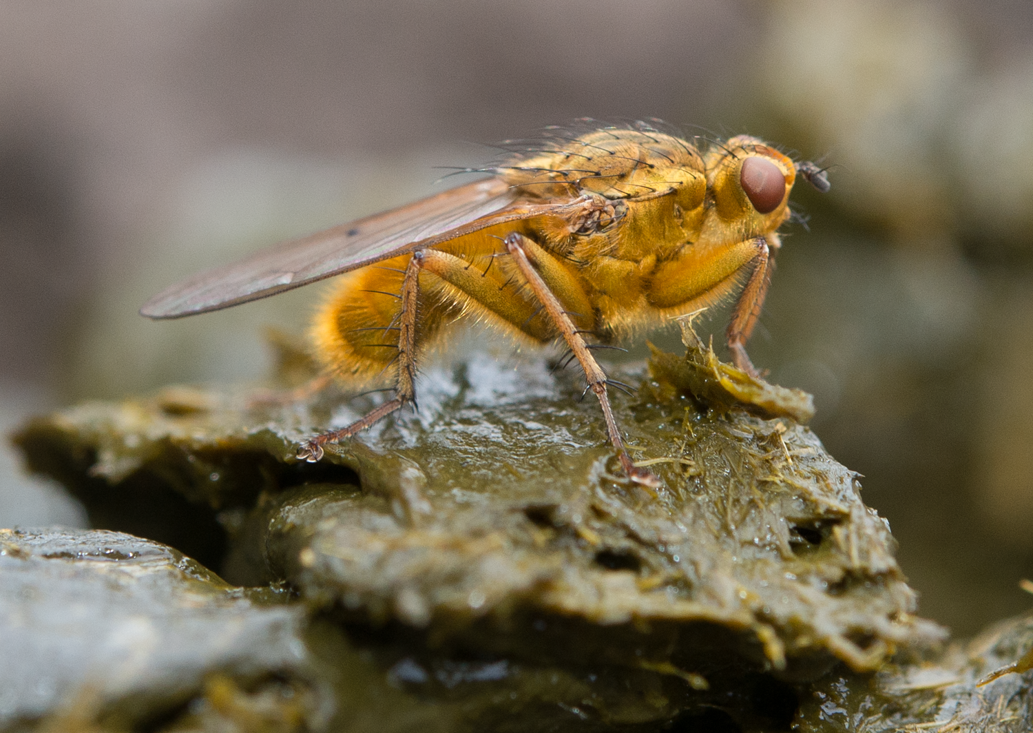 Fluelarver er viktige nedbrytere av møkk og åtsler. De gullhårede gjødselfluene er et vanlig syn på husdyrmøkk.
