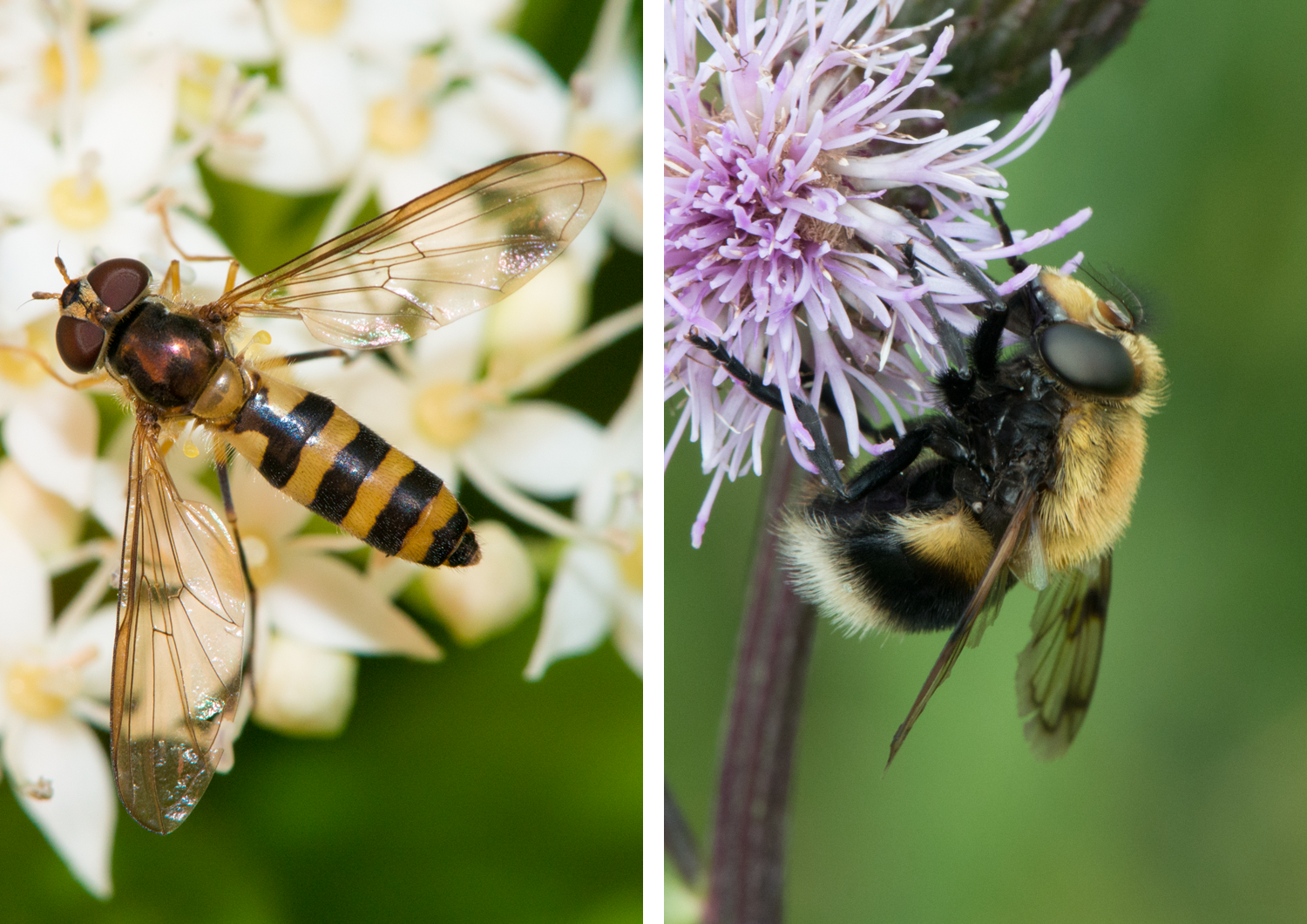 De fleste blomsterfluer etterligner stikkveps, deriblant gulbåndet krattblomsterflue (t.v.). Noen arter, slik som humleblomsterflua (t.h.), etterligner humler.