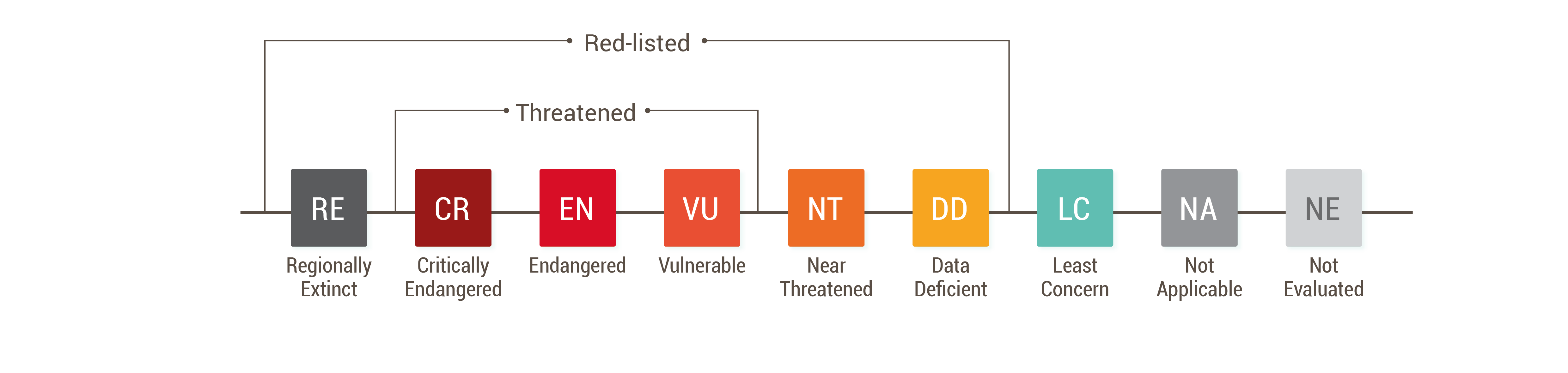 The criteria are used to assign species to one of the categories shown below. The categories reflect the level of risk that a species will go regionally extinct if conditions remain unchanged. Species in the categories Critically Endangered (CR), Endangered (EN) and Vulnerable (VU) are described as threatened species.