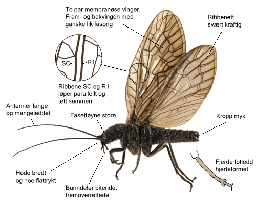 De vannlevende larvene kan kjennes på de fjorten lange gjellevedhengene på siden av bakkroppen og det lignende vedhenget på bakkroppsspissen.