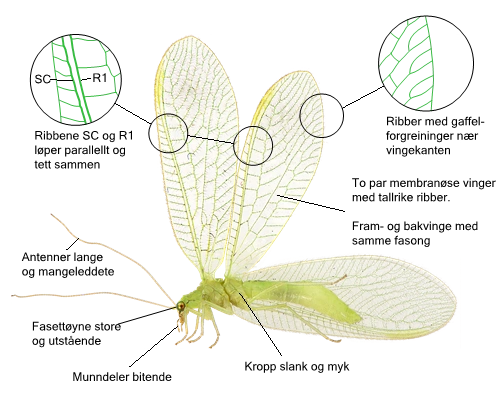 Det spesielle ribbemønsteret i vingene skiller ordenen fra alle andre insektordener unntatt kamelhalsfluene. Middløvene mangler dog dette ribbemønsteret.