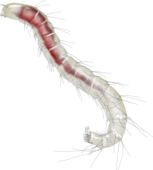 Larvene er lange og smale med rundt tverrsnitt. De mangler helt lemmer og har lange, bakoverrettede børster på kroppssegmentene. På siste kroppsledd finnes to korte vedheng. Hodekapselen er velutviklet men mangler øyne. Antennen består bare av ett ganske langt ledd. Munndelene er bitende.
