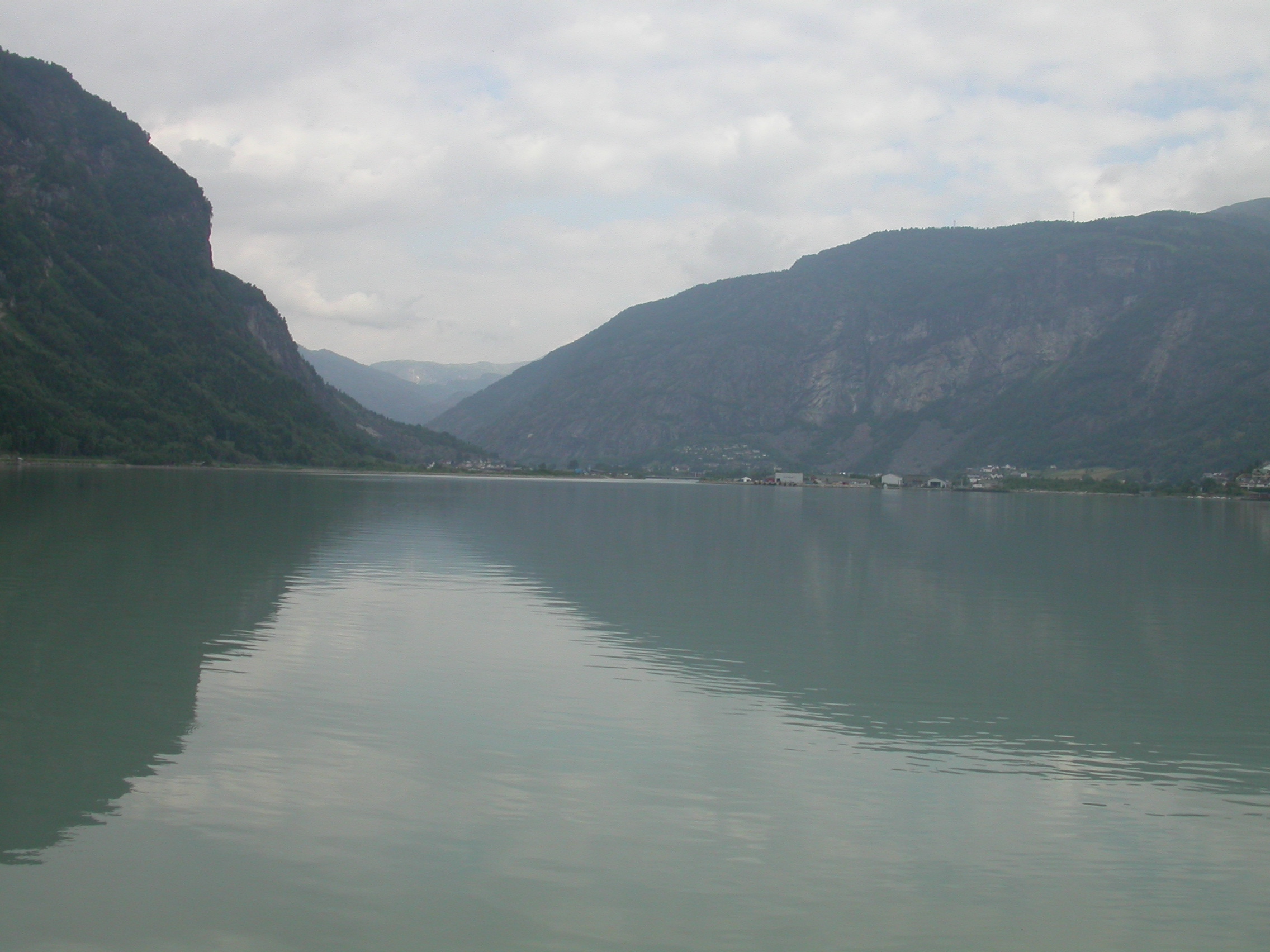 Fjord [1] sterkt ferskvannspåvirket fjord: Gaupnefjorden (Gaupne, Luster, Sogn og Fjordane), en sidearm til Sognefjorden der en rekke breelver har sitt utløp. Den grågrønne fargen skyldes suspenderte bresedimenter.