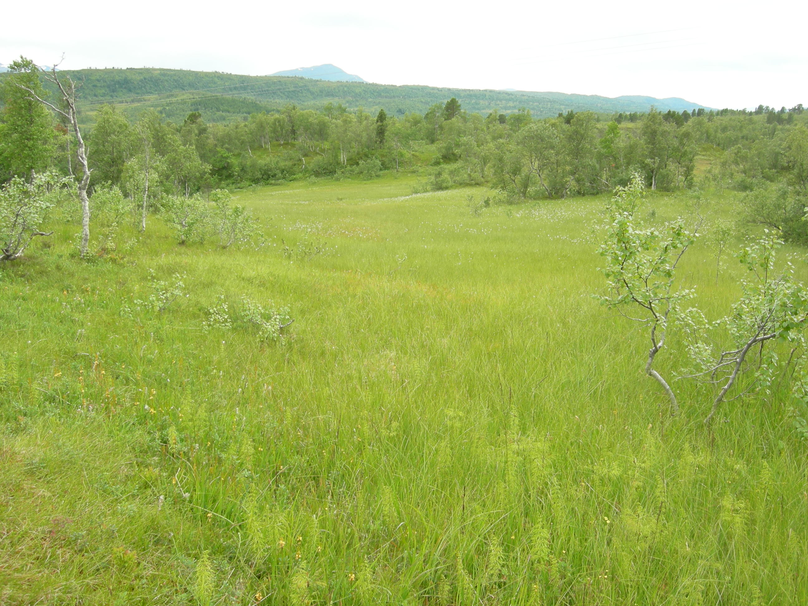 Våtmarksmassiv [11] flommyr. Bildet viser Atnasjømyrene (Sollia, Stor-Elvdal, Hedmark), ett av de aller fineste eksemplene på flommyr i Norge. På Atnasjømyrene alternerer flommyr med partier med [8] jordvannsdominert myr og med innsjø [7] moderat kalkfattig humussjø.