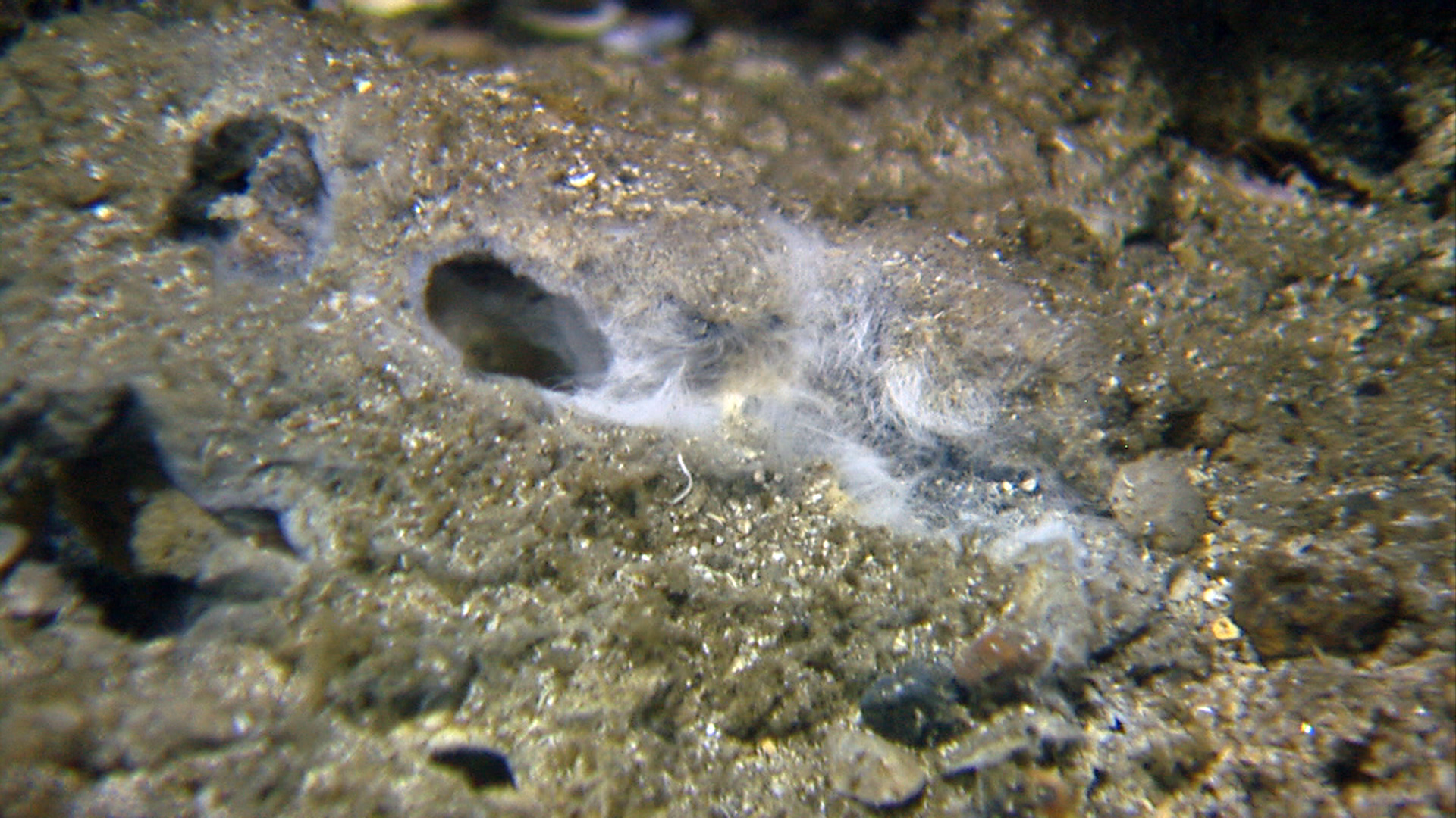 Kald havkildebunn [1] utstrømmingsgrop-bunn. Bildet er tatt på 207 m dyp i Hola utenfor Vesterålen. Avstanden mellom de to røde laserpunktene er 10 cm.