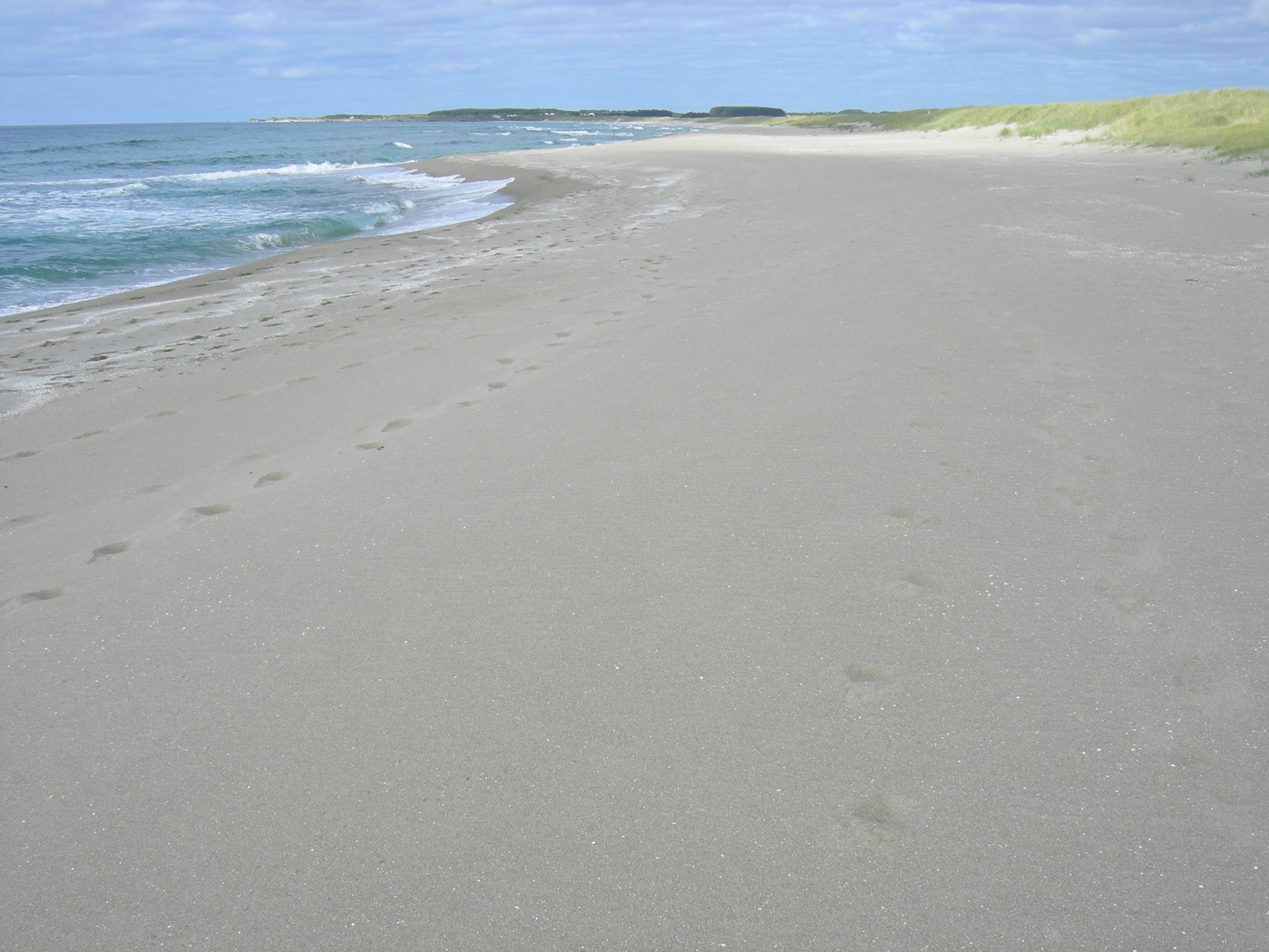 Stein-, grus- og sandstrand [2] sand-forstrand, uten vegetasjon. Innenfor sandstranda reiser sanddyner seg (natursystem-hovedtypen sanddynemark). Brusand, Ogna, Hå, Rogaland.