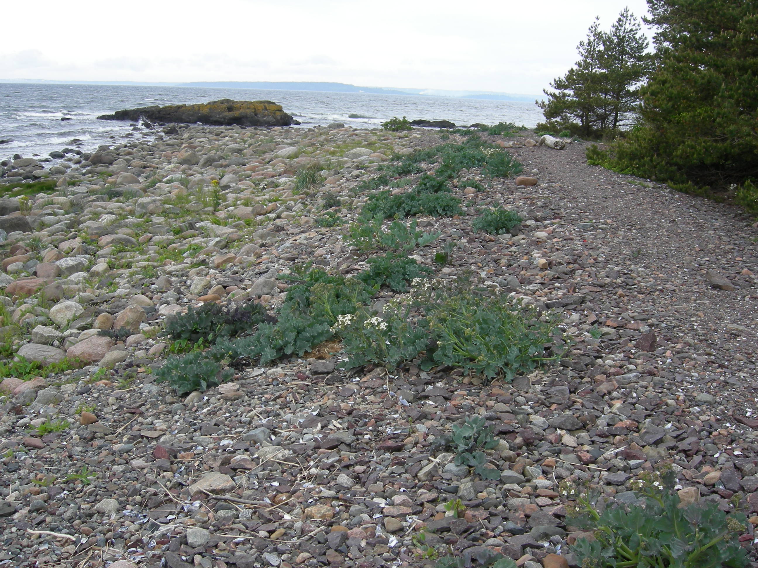 Stein-, grus- og sandstrand [4] stein-forstrand med varierende kornstørrelse, flekkvis med akkumulering av litt finmateriale og små strandengfragmenter. Strandkål (Crambe maritima) er en art som kan vokse direkte i stein- og grussubstrat på ikke for sterkt eksponerte steder. S f Bredebukt, Jeløy, Moss, Østfold.