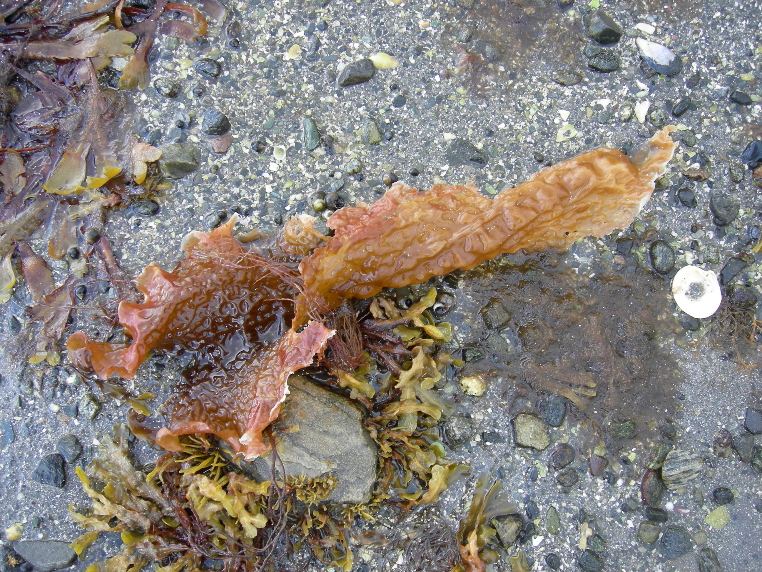 Stein-, grus- og sandstrand, overgang mellom grunntypene [2] sand-forstrand, [4] stein-forstrand og [6] skjell-forstrand. Bildet, som er et nærbilde av bunnen i vannstrand-delen av fjæresonen, viser et godt blandet substrat (dominende kornstørrelse fra sand til stein) med stort skjellinnblanding. Sukkertaren (Laminaria saccharina) er driftmateriale, mens tangen (flere ater) er festet til større steiner og representerer overganger til fjæresone-vannstrand på fast bunn. Osen, Nord-Gutvik, Gutvik, Leka, Nord-Trøndelag.