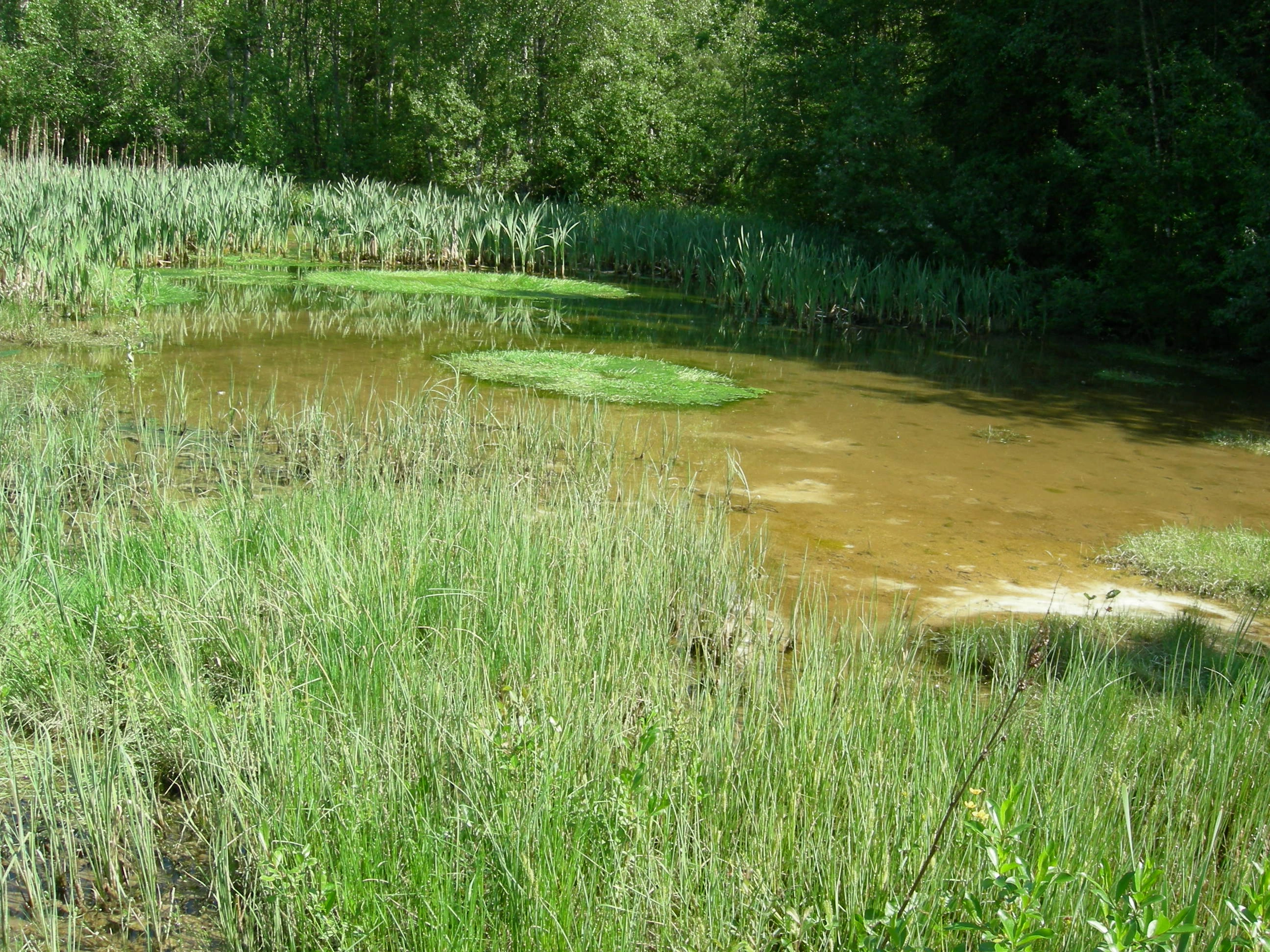 Lite, svært grunt tjern med sterk kildevannstilførsel fra flere små oppkommer i kanten til høyre i bildet (og fra kildesig utenfor bildekanten). Bunnen i tjernet hører til natursystem-hovedtypen ferskvannskildebunn. Hovin, Ullensaker, Akershus.