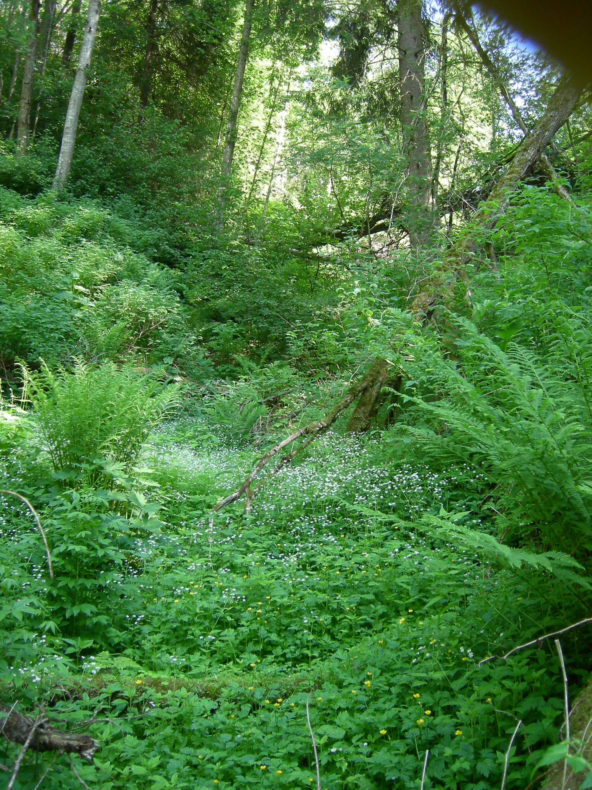 Svak kilde og kildeskogsmark [2] kalkrik svak grunnkilde. Bildet viser kildeskogsmark i lisider i silt- og leirdominert ravine på Romerike (N f Lyshaughagen, Nannestad, Akershus), med gråor (Alnus incana) og gran som dominerende treslag og en frodig undervegetasjon dominert av skogburkne (Athyrium filix-femina). I bunnen av ravinen åpne partier dominert av bekkekarse (Cardamine amara) og krypsoleie (Ranunculus repens).