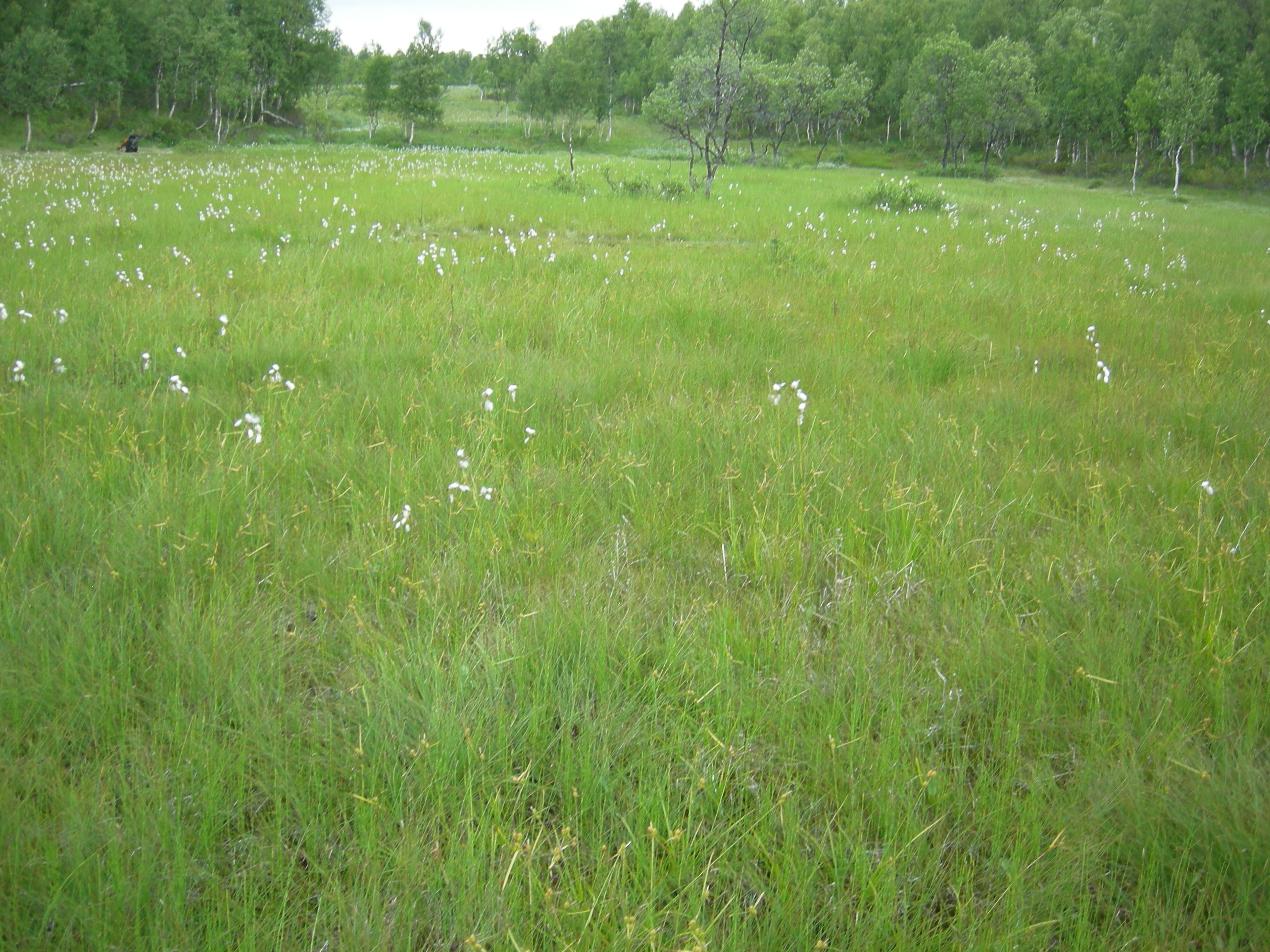 Svak kilde og kildeskogsmark [6] kalkkildemyr med gulstarr (Carex flava), huldrestarr (C. heleonastes), taglstarr (C. appropinquata) og breiull (Eriophorum latifolium). Sølendet, Brekken, Røros, Sør-Trøndelag.