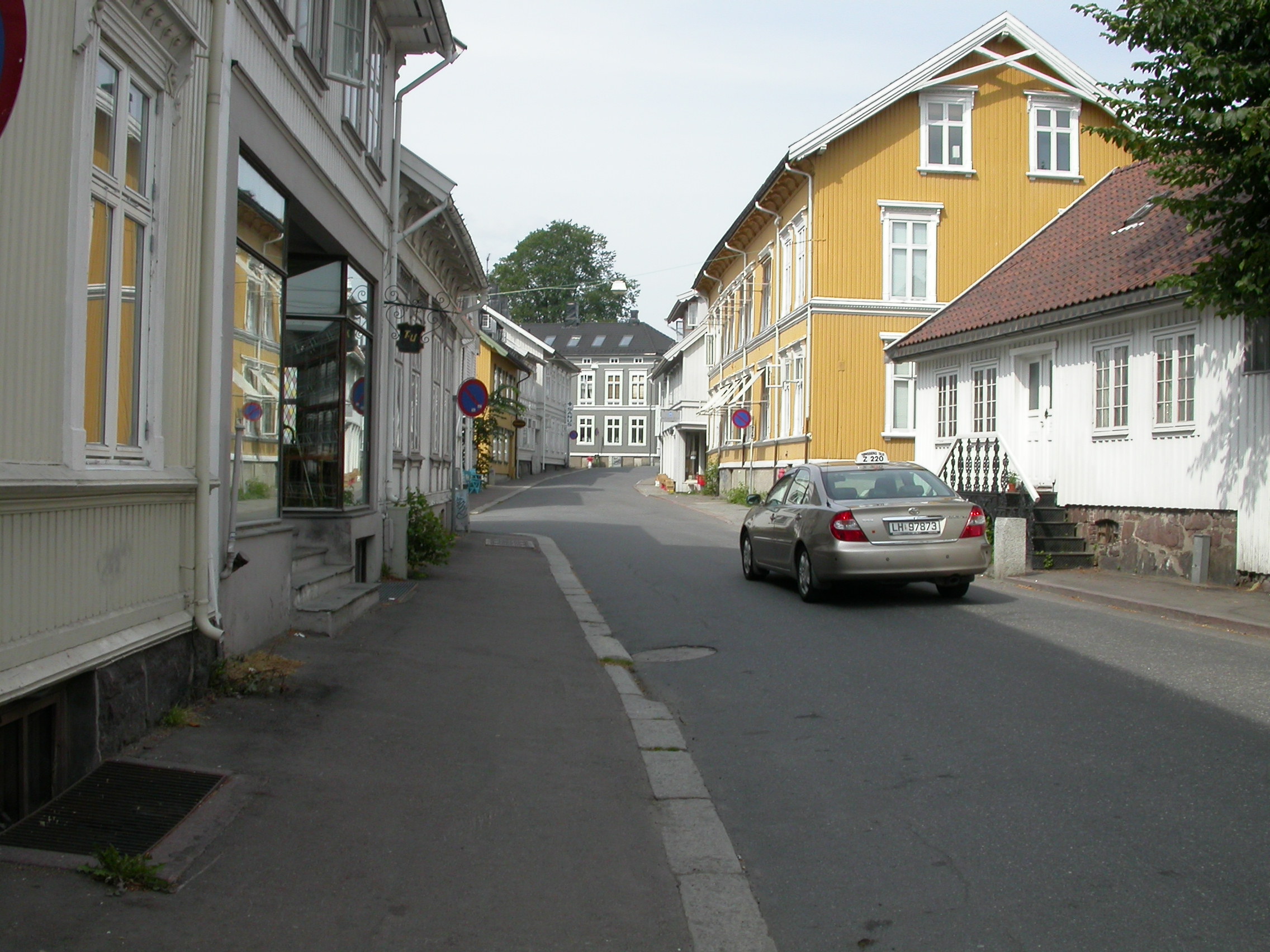 Grunntypen konstruert fastmark [4] bybebyggelse omfatter stor variasjon. Bildet viser eldre trehusbebyggelse i Storgata i Tønsberg (Vestfold). Bybebyggelse forekommer nesten alltid i mosaikk med transportutbyggingsområder, først og fremst grunntype [9] vegbane med fast dekke.