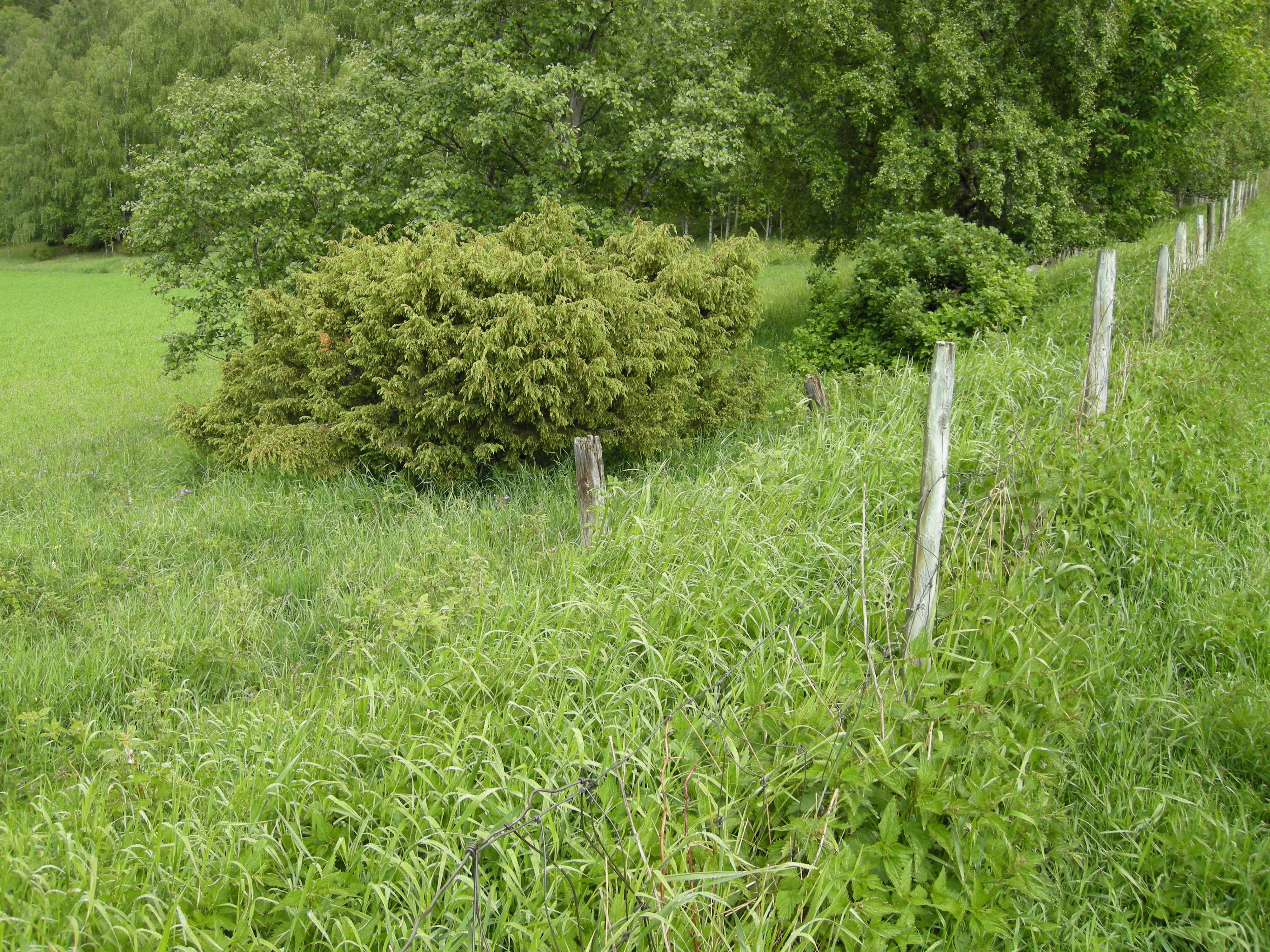 Åker og kunstmarkseng [4] kunstmarkseng-kant. Brei kantsone med nitrofile arter [blant annet stornesle (Urtica dioica)] mellom [3] fulldyrket åker og kunstmarkseng (bak i bildet) og [2] overflatedyrket kunstmarkseng (utenfor bildekanten til høyre). Sygard Snerle, Vågå, Oppland.