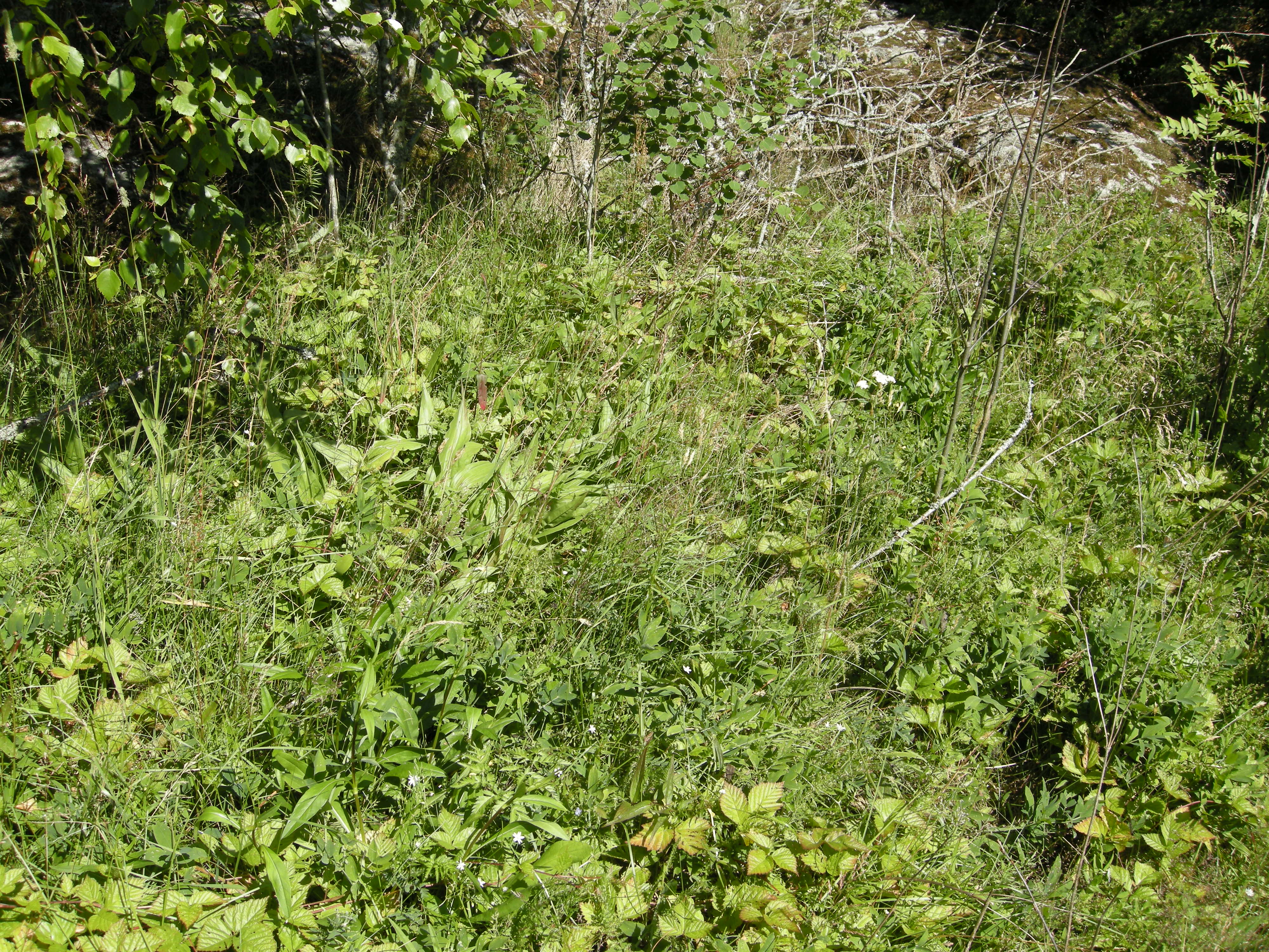 Kulturmarkseng [4.1] kalk-slåtteeng med lang, kontinuerlig brukshistorie fra Svartdal (Flatdal, Seljord, Telemark). Marka på bildet er friskere enn i Bilde 13, noe som gir seg utslag i et frodigere feltsjikt, blant annet med rikelig forekomst av stortveblad (Listera ovata), kvitbladtistel (Cirsium heterophyllum) og storblåfjær (Polygala vulgaris).