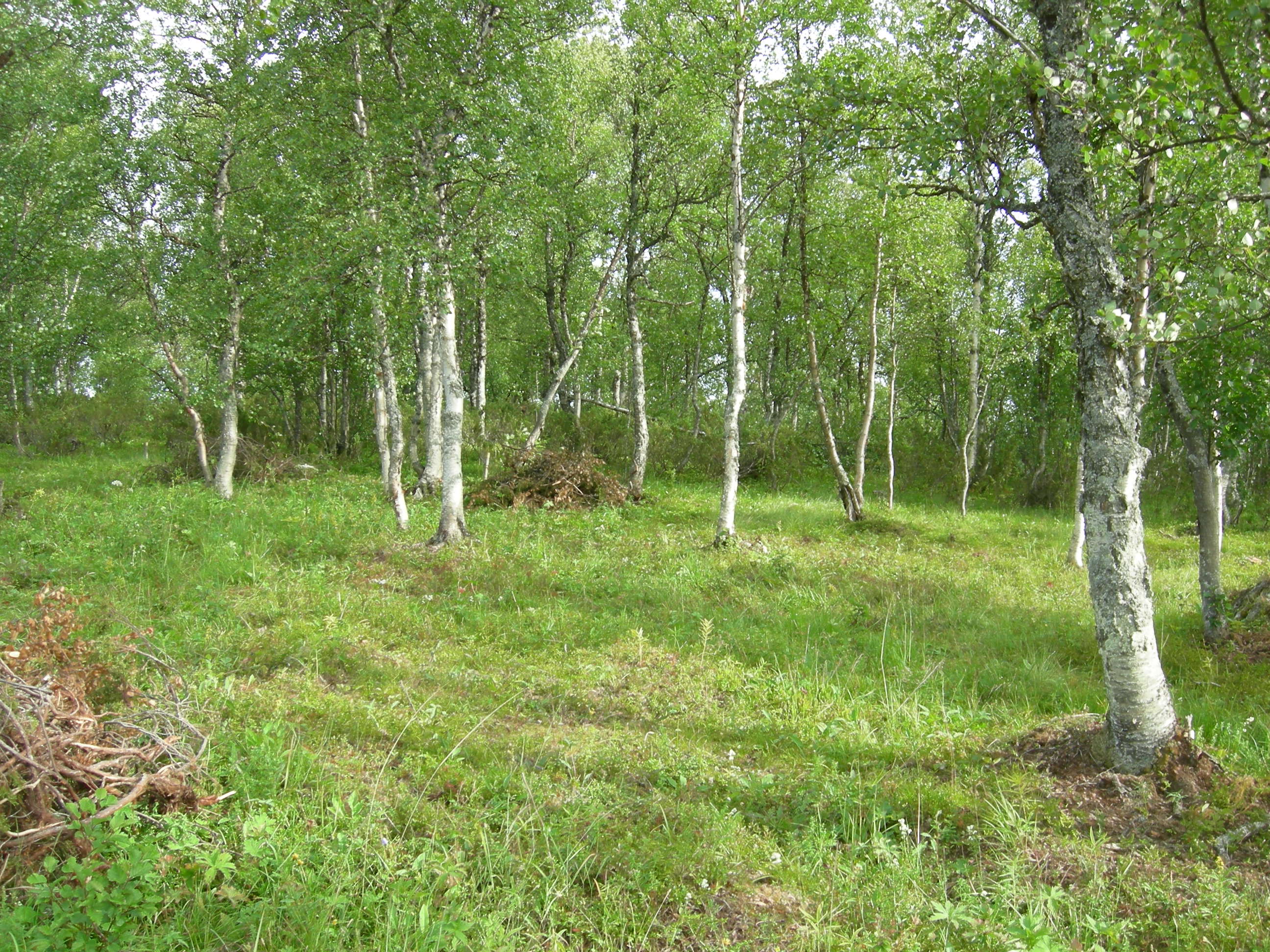 Kulturmarkseng [12] lågurt-kulturmarkskant kan finnes som åpne, smale kantsoner i jordbrukslandskapet eller som tresatte beite- eller slåtteenger (inkludert hagemarksskoger og slåttemarksskoger) som, delvis på grunn av treinnflytelsen, beholder et kantpreg. Særlig tydelig er kantpreget i slåttemarksskoger. Den bjørkedominerte slåttemarksskogen på bildet er restaurert og planmessig skjøttet på tradisjonelt vis gjennom flere tiår. Sølendet, Brekken, Røros, Sør-Trøndelag.