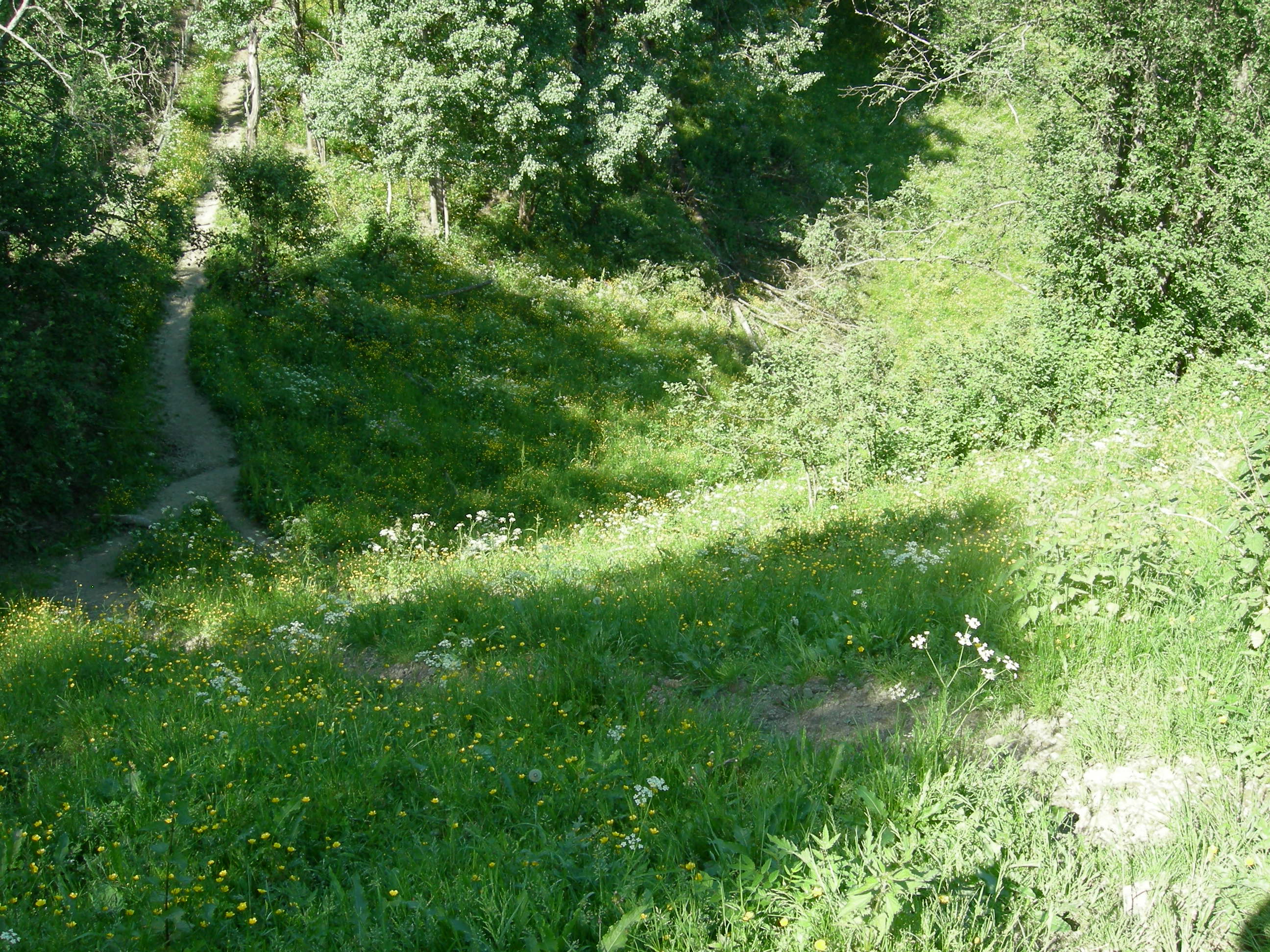 Kulturmarkseng [3.2] lågurt-beiteeng på marin leirgrunn [landformenheten ravine (ER–3)] på Romerike (Ukkestad, Nannestad, Akershus), med hundekjeks (Anthriscus sylvestris) og krypsoleie (Ranunculus repens) som karakteristiske arter.