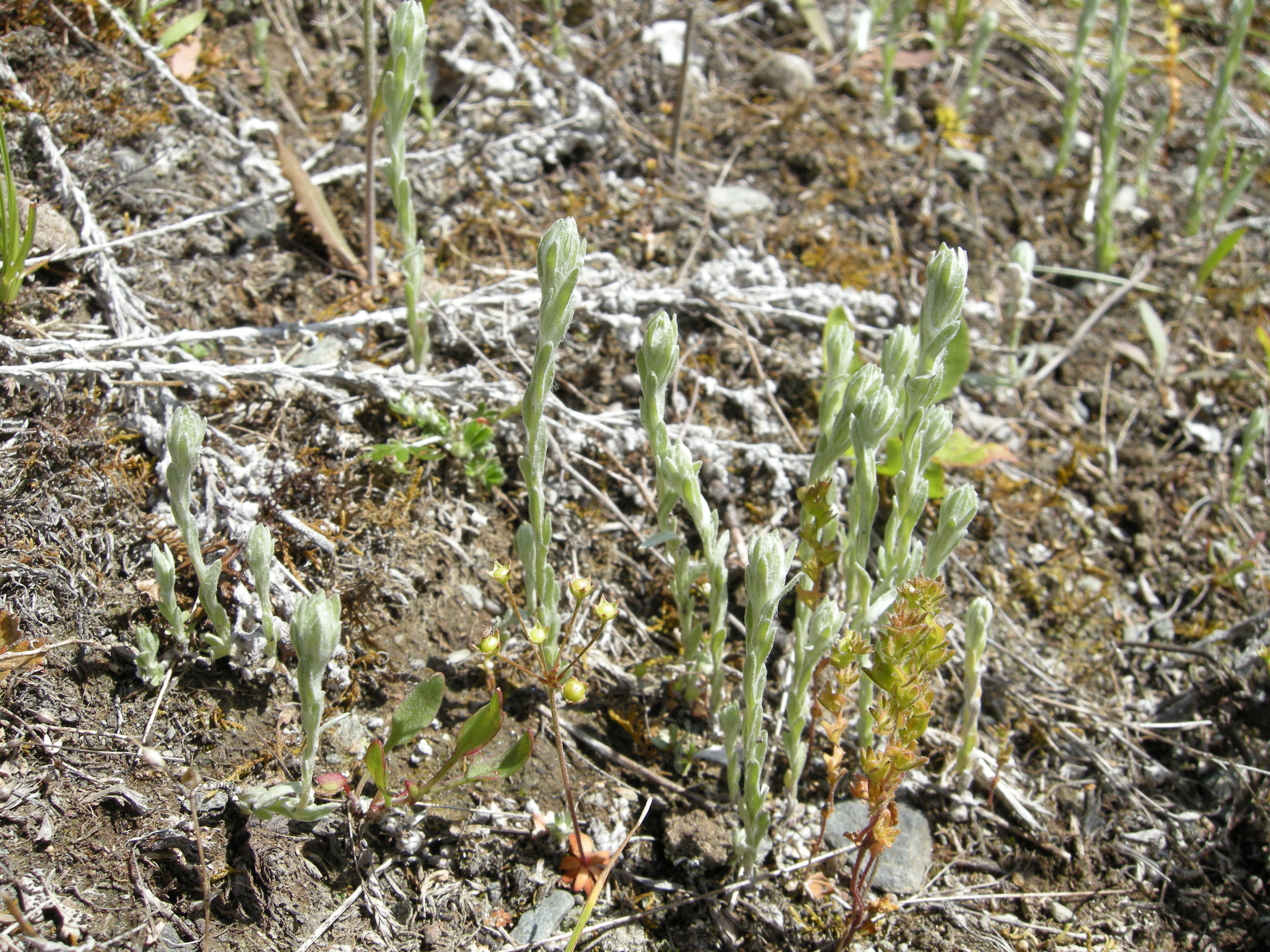 Kulturmarkseng [4.2] kalk-beiteeng; nærbilde av tørrbakken i Bilde 15 (Vågå, Oppland). Den sparsomme vegetasjonen indikerer et sterkt tørkepreg. Bildet viser ullurt (Logfia arvensis) og, avblomstret foran i bildet, smånøkkel (Androsace septentrionalis), to arter på den norske rødlista.