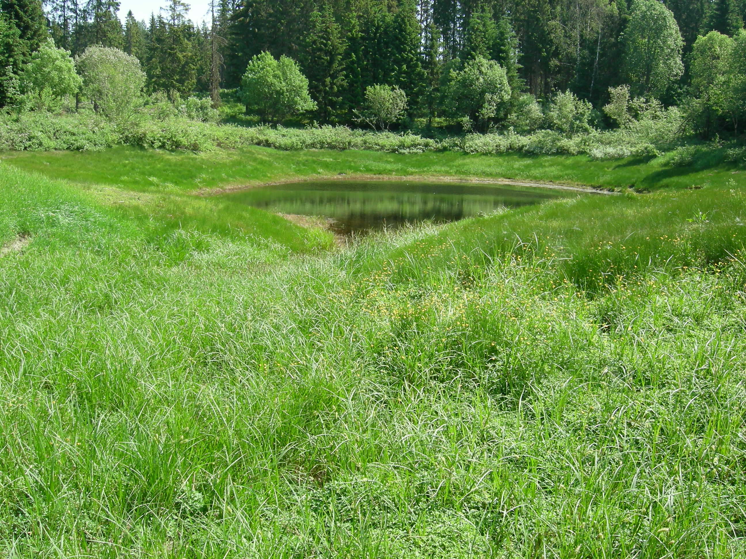 Åpen flomfastmark [3] åpen sand-erosjonsflommark er en svært særpreget naturtype, som er knyttet til store sanddominerte breavsetninger. Bildet viser flommarka omkring Nordkulpen (Hovin, Ullensaker, Akershus), som utsettes for kraftig erosjon under vårflommen når store mengder smeltevann skal føres vekk fra det store, flate nedbørfeltet. Åpen flomfastrmark finnes som et breit belte mellom tjernet og en smal stripe av flomskogsmark dominert av svartvier (Salix myrsinifolia). Foran i bildet, på jord med større organisk innhold, dominerer sennegras (Carex vesicaria).