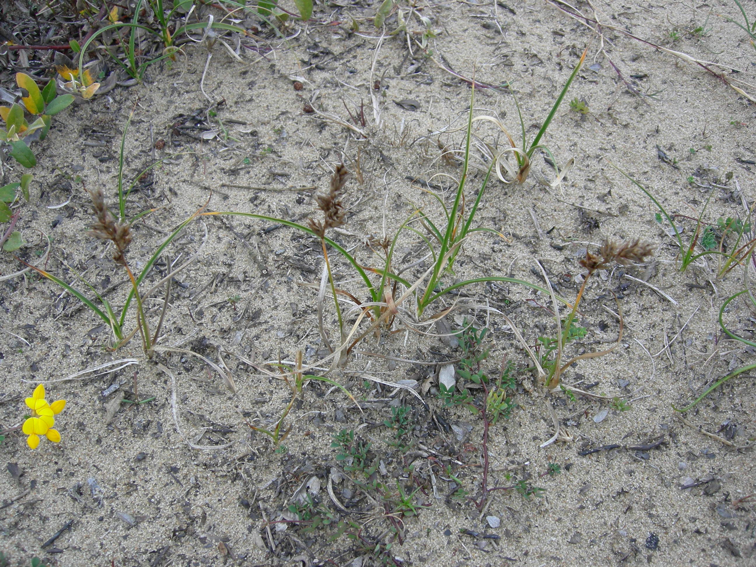 Detaljbilde av sanddynemark [4] erodert dyne (deflasjonsdyne), som viser den karakteristiske voksemåten til sandstarr (Carex arenaria), en av de viktigste sandbindende artene. Sandstarrens krypende jordstengler produserer skudd i karakteristiske rekker. Listastrendene, Vanse, Farsund, Vest-Agder.