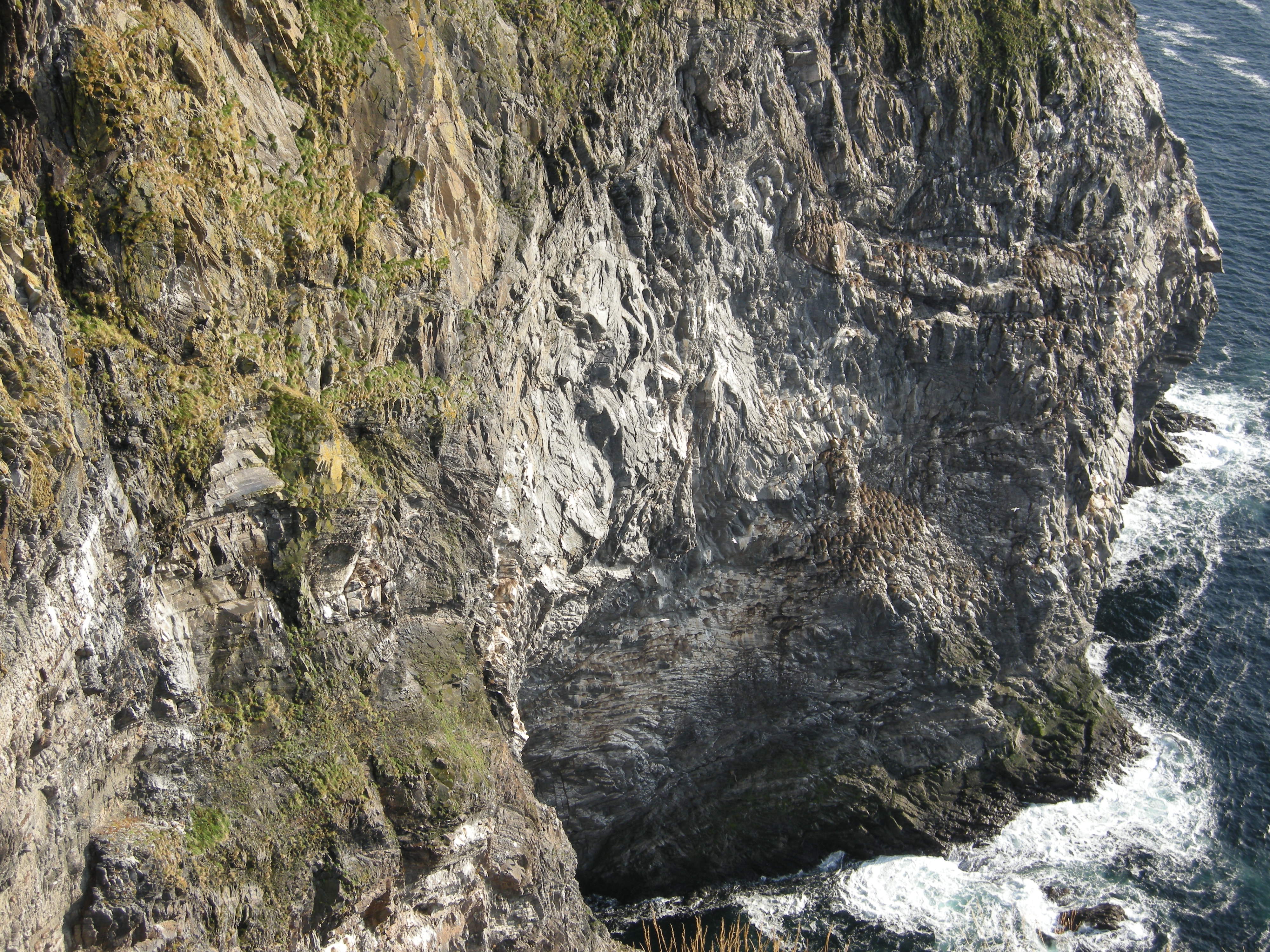 Nærbilde av nesten vertikal vegg med fugleberg i fuglefjell på Runde (Herøy, Møre og Romsdal). Den svakt oransje fargen skyldes forekomst av messinglav (Xanthoria spp.), som er typisk for fugleberg [1] moderat gjødslet kalkfattig fugleberg. Nedover mot høyre i bildet øker fuglegjødslingen, og det gråhvite området nær sjøen er en mosaikk avgrunntypene [3] sterkt gjødslet kalkfattig fugleberg og [5] overgjødslet fugleberg. Det gråsvarte feltet litt til høyre nedenfor midten i bildet er grastuer som er døde på grunn av overgjødsling.