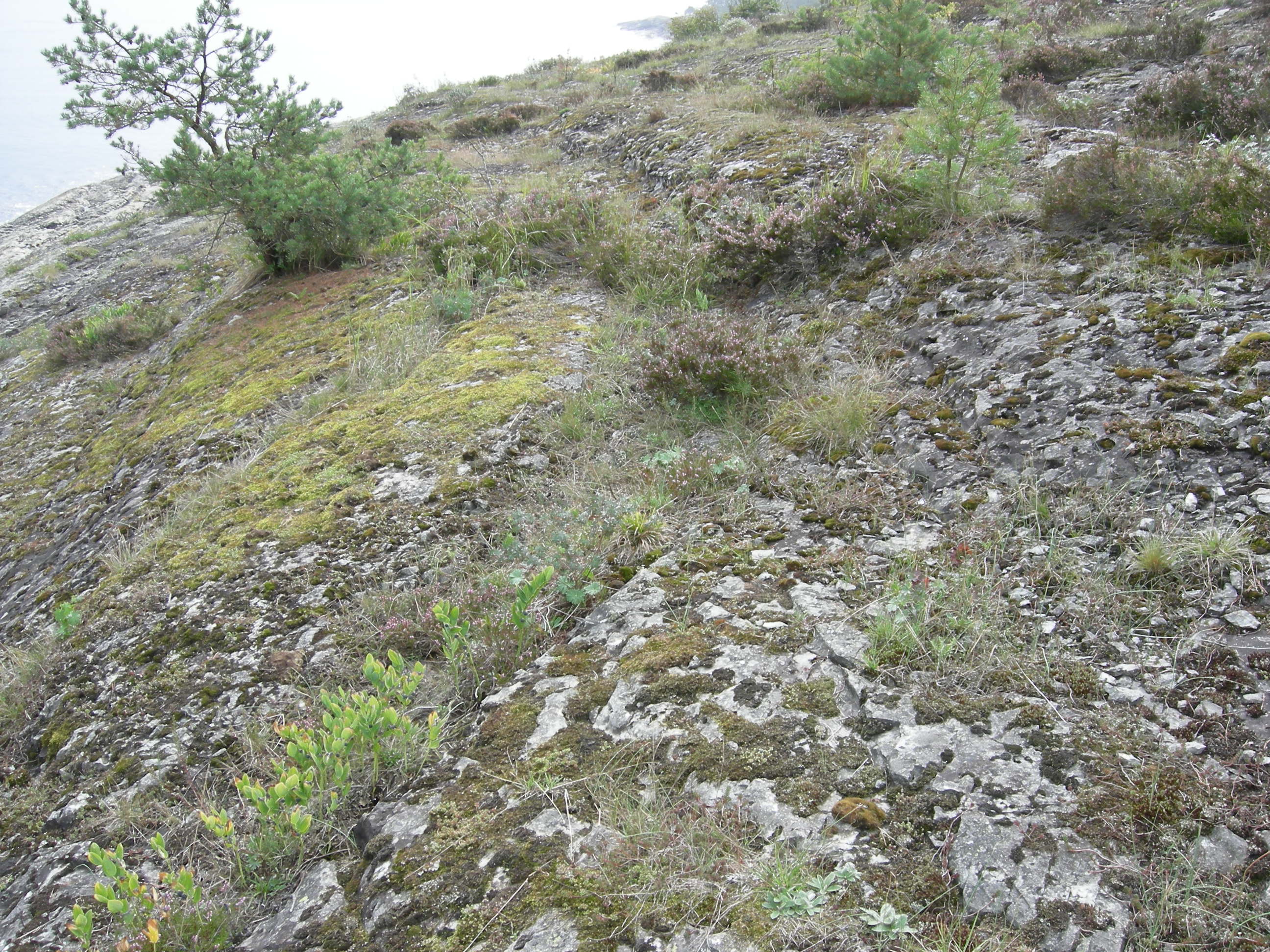 Nakent berg [1] kalkfattig knaus på granitt nær sjøen (Asmaløy, Hvaler, Østfold). Berget er tydelig isskurt, med landformenheten P-form [EB–10]. Den flekkvise fordelingen av lav på berget gjenspeiler eksponering for havsaltpåvirkning; flater som vender mot sjøen er vegetasjonsfrie mens toppflater og flater som vender fra sjøen har tett lavvegetasjon.