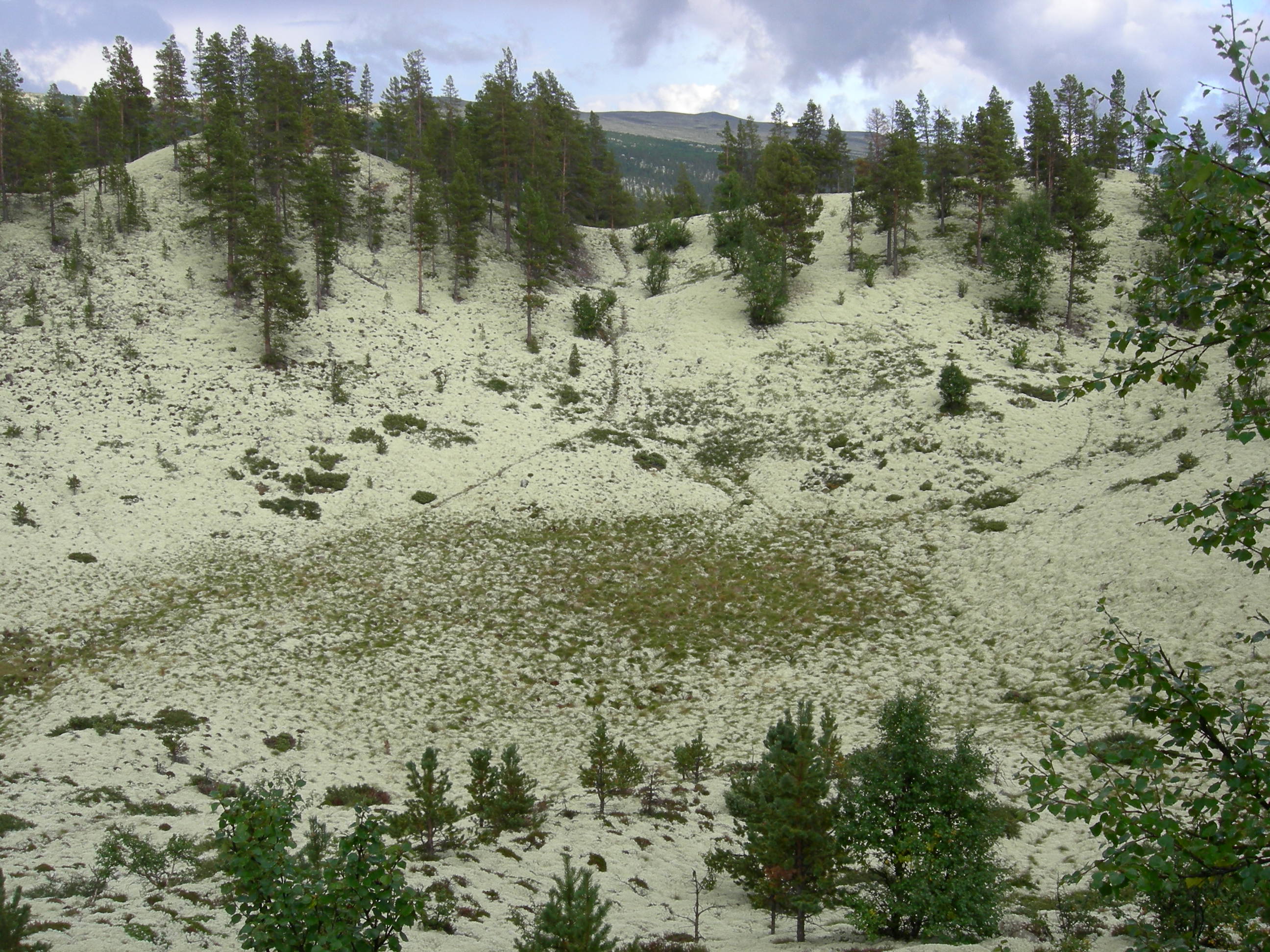 Detaljbilde av vegetasjonen i isinnfrysingsmark [1] kalkfattig isinnfrysingsmark, som blant annet viser at smyle (Avenella flexuosa), kvitkrull (Cladonia stellaris), lys reinlav (C. arbuscula agg.) og storbjørnemose (Polytrichum commune) er viktige arter. Grimsmoen (Folldal, Hedmark).
