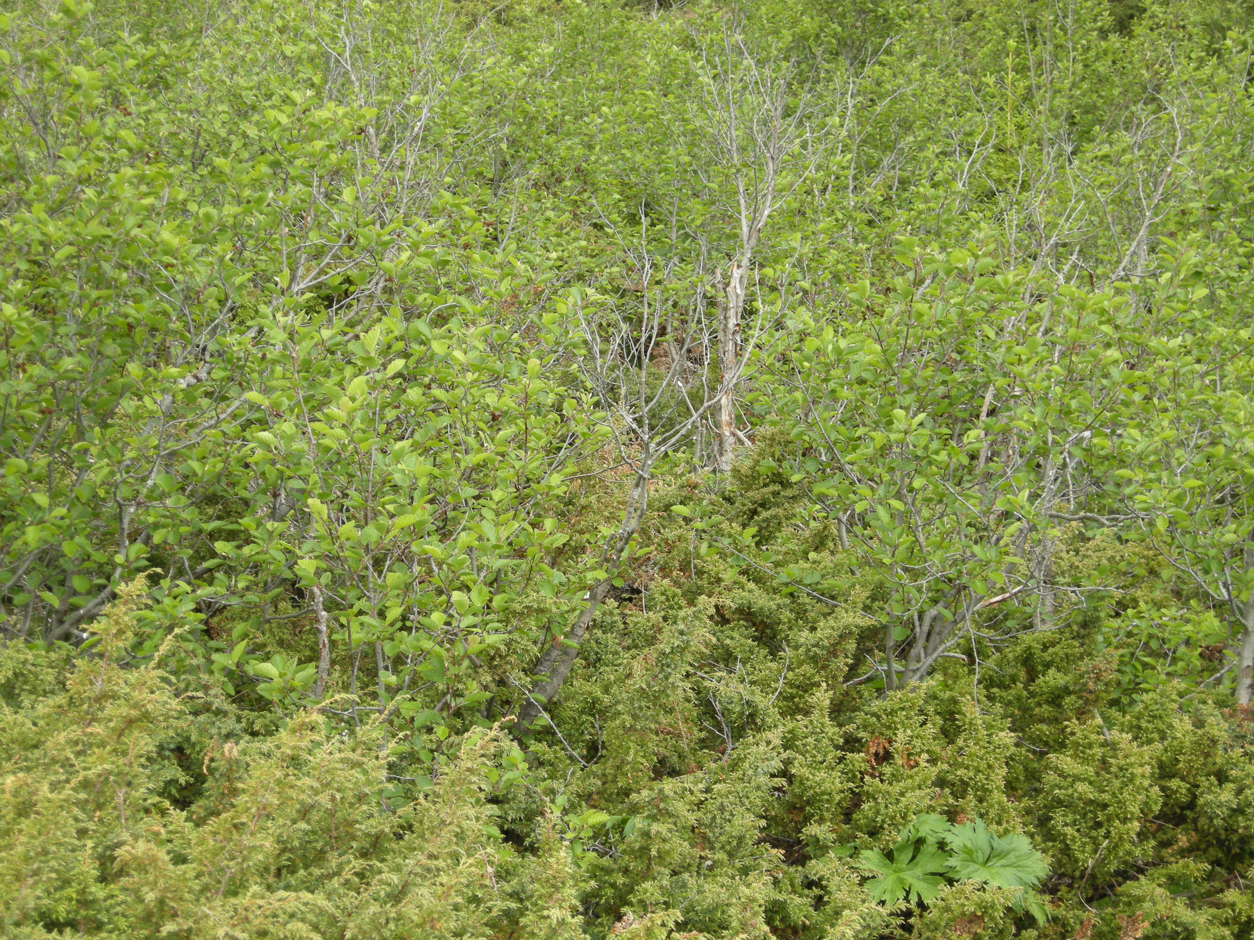 Boreal hei [3] intermediær boreal hei ovenfor Berge i Vågå (Oppland), i gjengroingstilstand (GG) trinn 3 tidlig gjenvekstsuksesjonsfase, dominert av einer (Juniperus communis) og (bak i bildet) gråor (Alnus incana).
