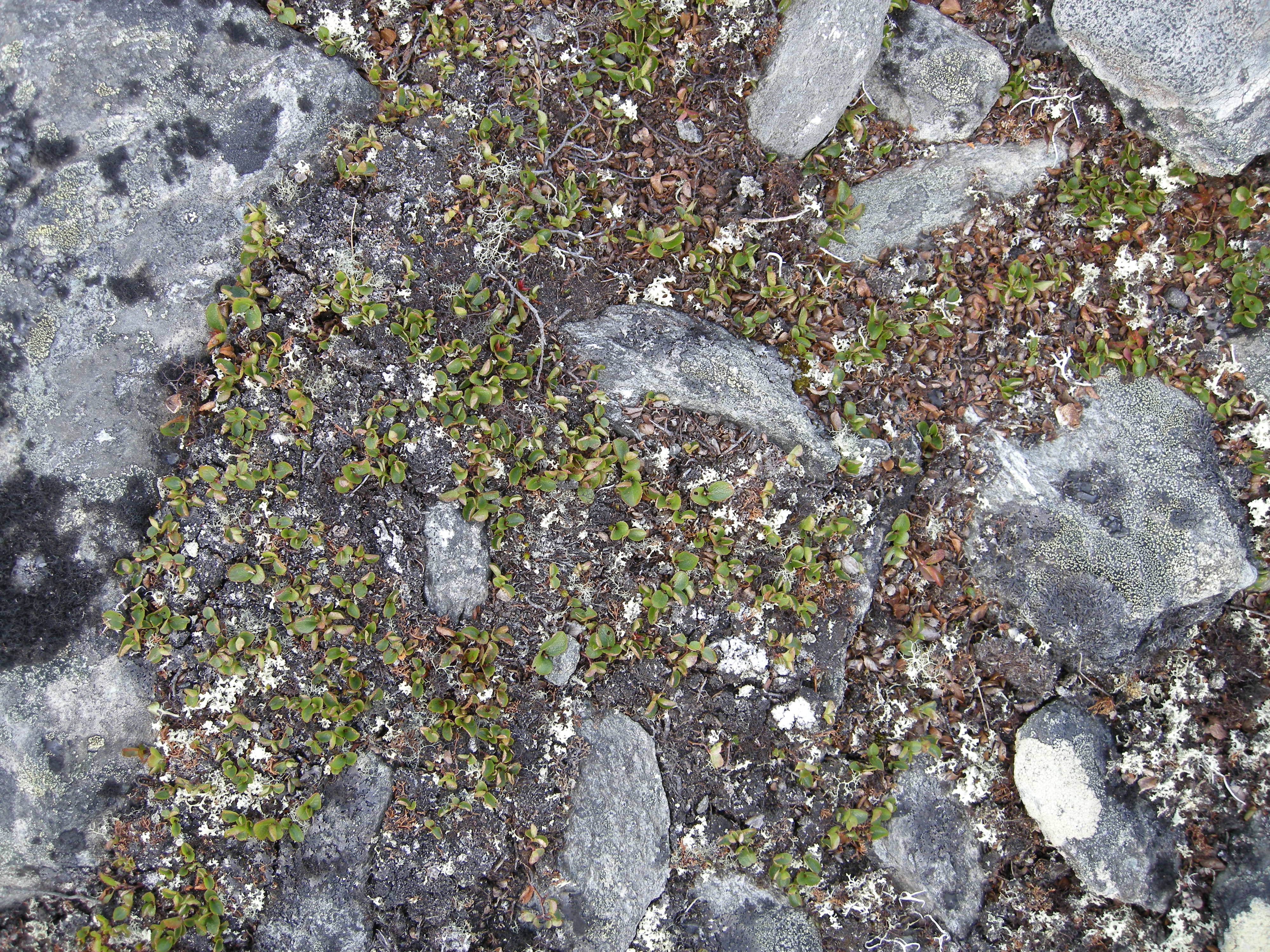 Detaljbilde av vegetasjonen i frostmark og frosttundra [3] kalkfrostmark på toppen av S. Knutshø (Oppdal, Sør-Trøndelag). Musøre (Salix herbacea) forekommer rikelig.