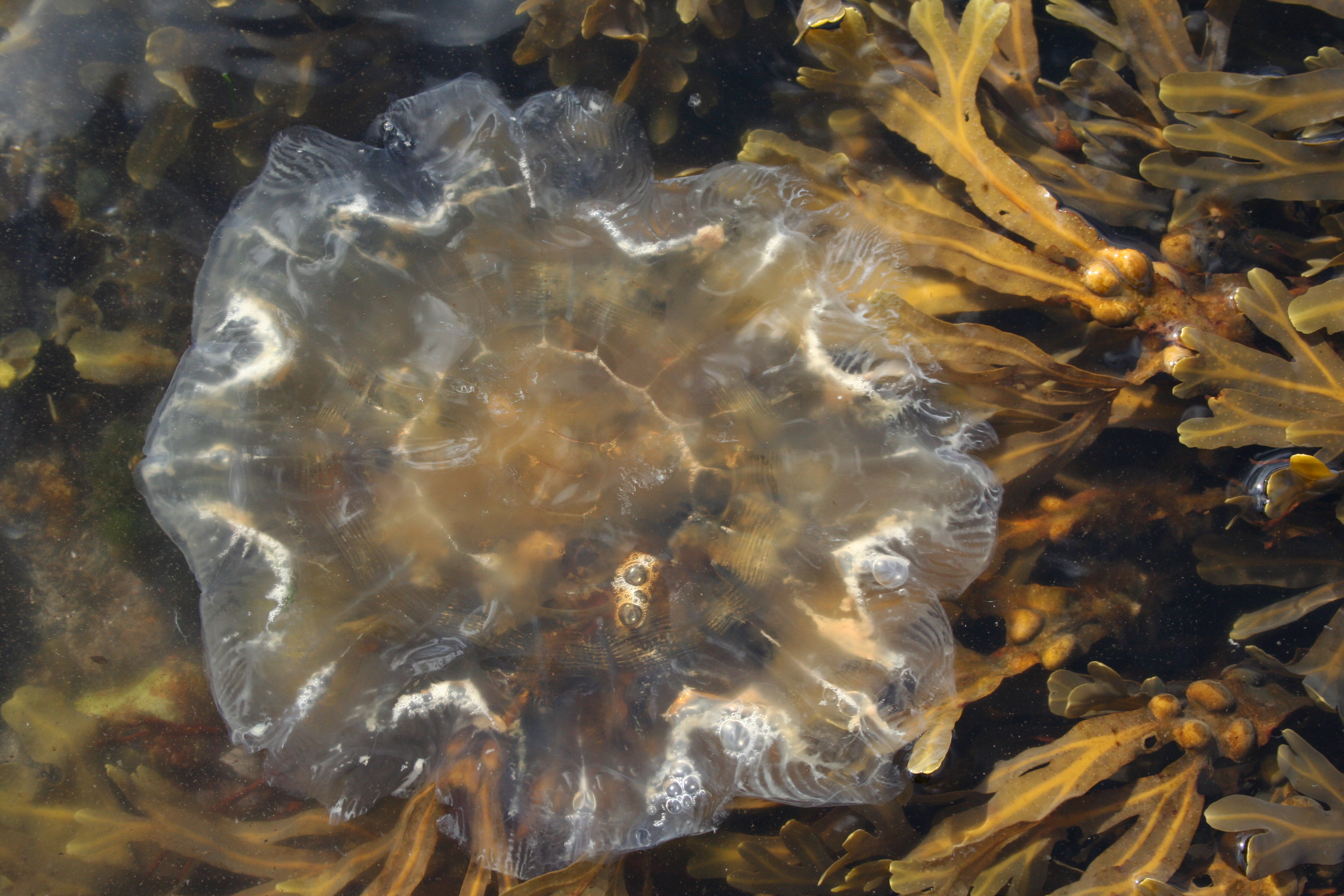 Døde dyr i marine systemer, illustrert ved død glassmanet som flyter i vannstrand-delen av fjæresonen. (natursystem-hovedtypen fjæresone-vannstrand på fast bunn). Døde dyr er næring og skjulested for mange mikroorganismer. Bildet er tatt ved Lade (Trondheim, Sør-Trøndelag) i Trondheimsfjorden.