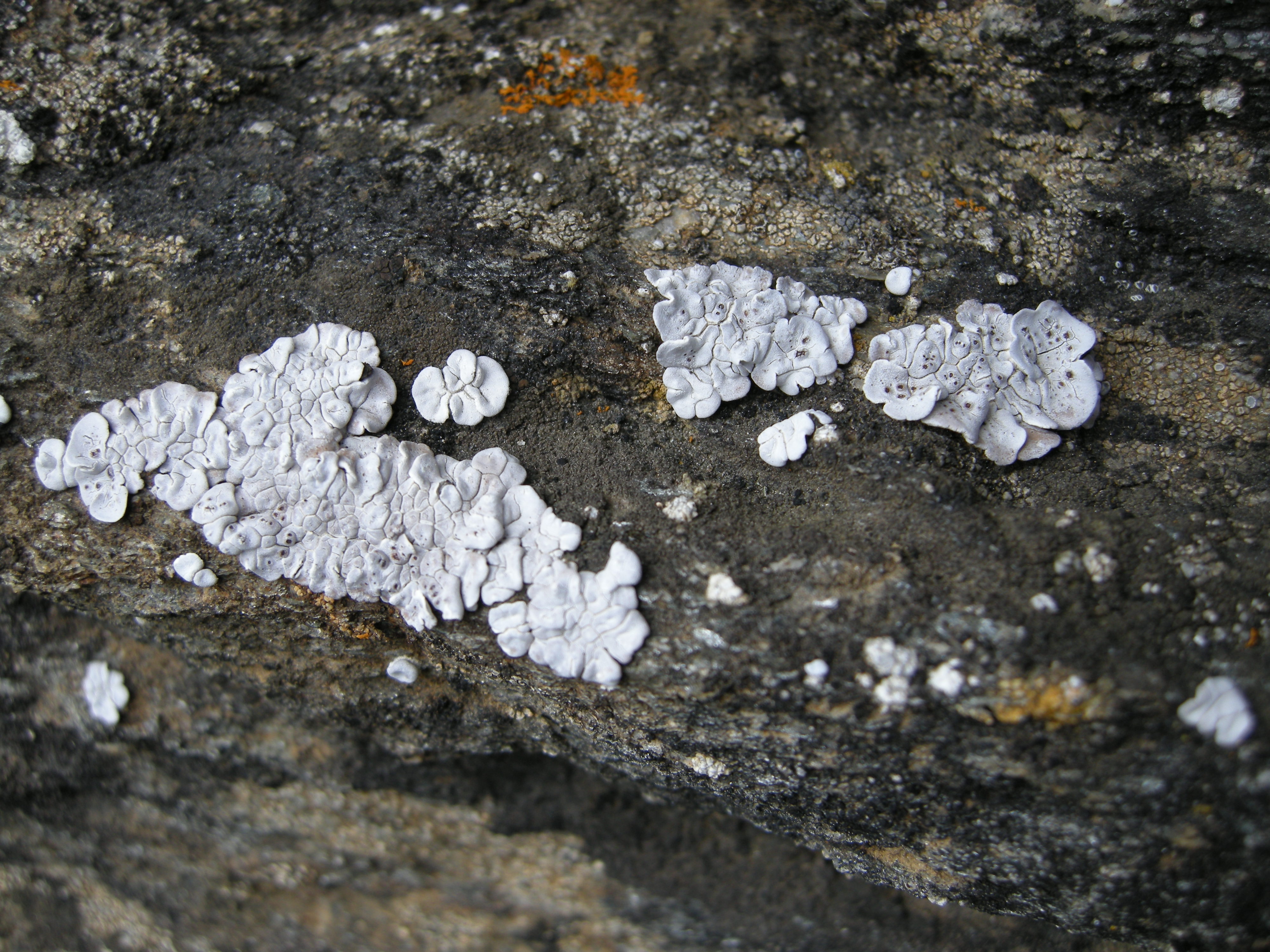 Grovere uorganiske substrater på land [35] normalt kalkbergsubstrat med høy innstråling, eksemplifisert ved liten, sørvendt bergvegg med artsrik lavflora (Berge, Vågå, Oppland). Midt i bildet ses kalkskjold (Glypholechia scabra), en karakteristisk art på dette livsmediet. Øverst i bildet raudberglav (Xanthoria elegans).