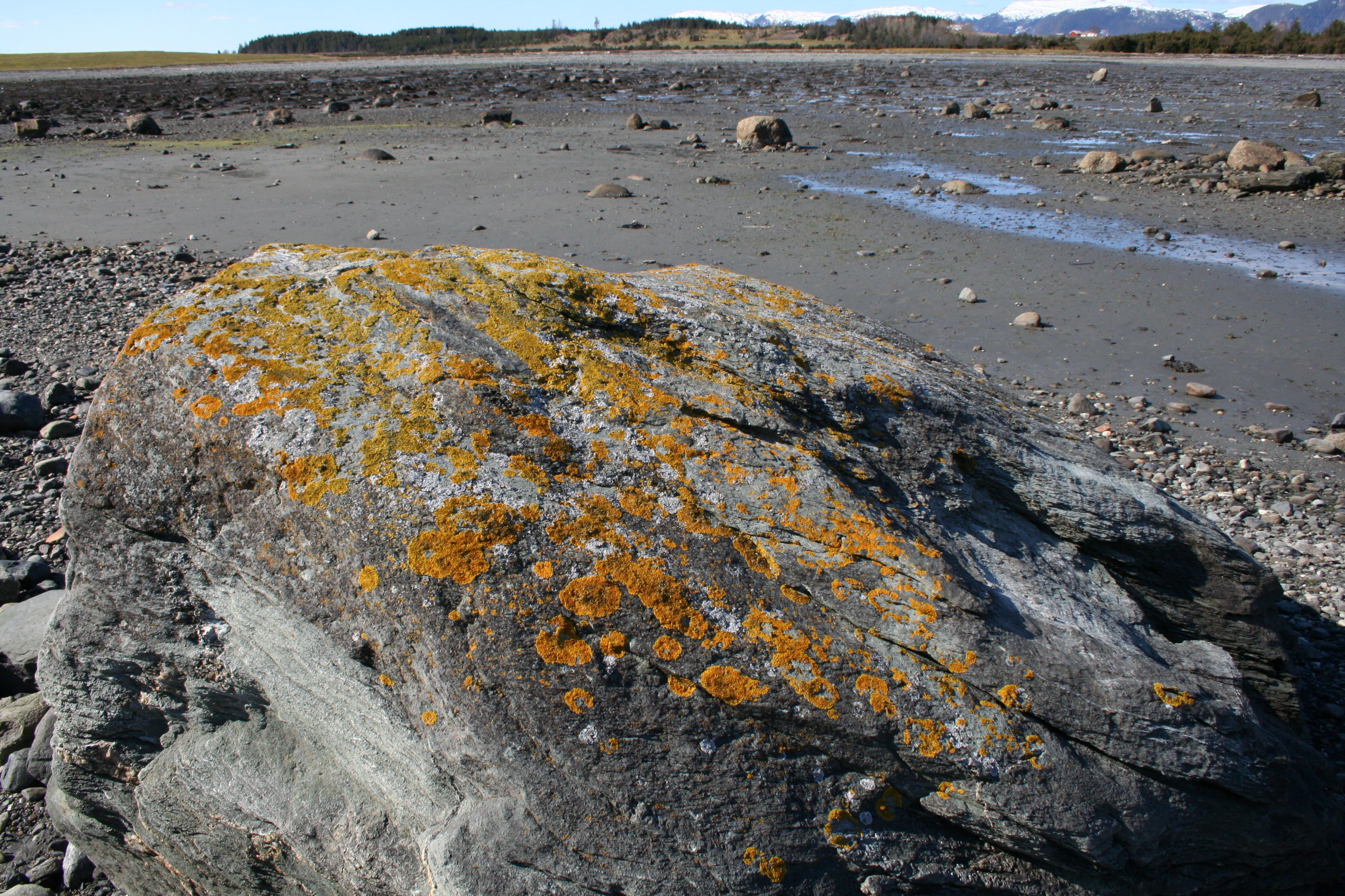 Grovere uorganiske substrater på land [71] sterkt saltpåvirket bergsubstrat. Bildet viser messinglav (Xanthoria sp.) i på blokk i øvre del av fjæresonen (Tautra, Frosta, Nord-Trøndelag).