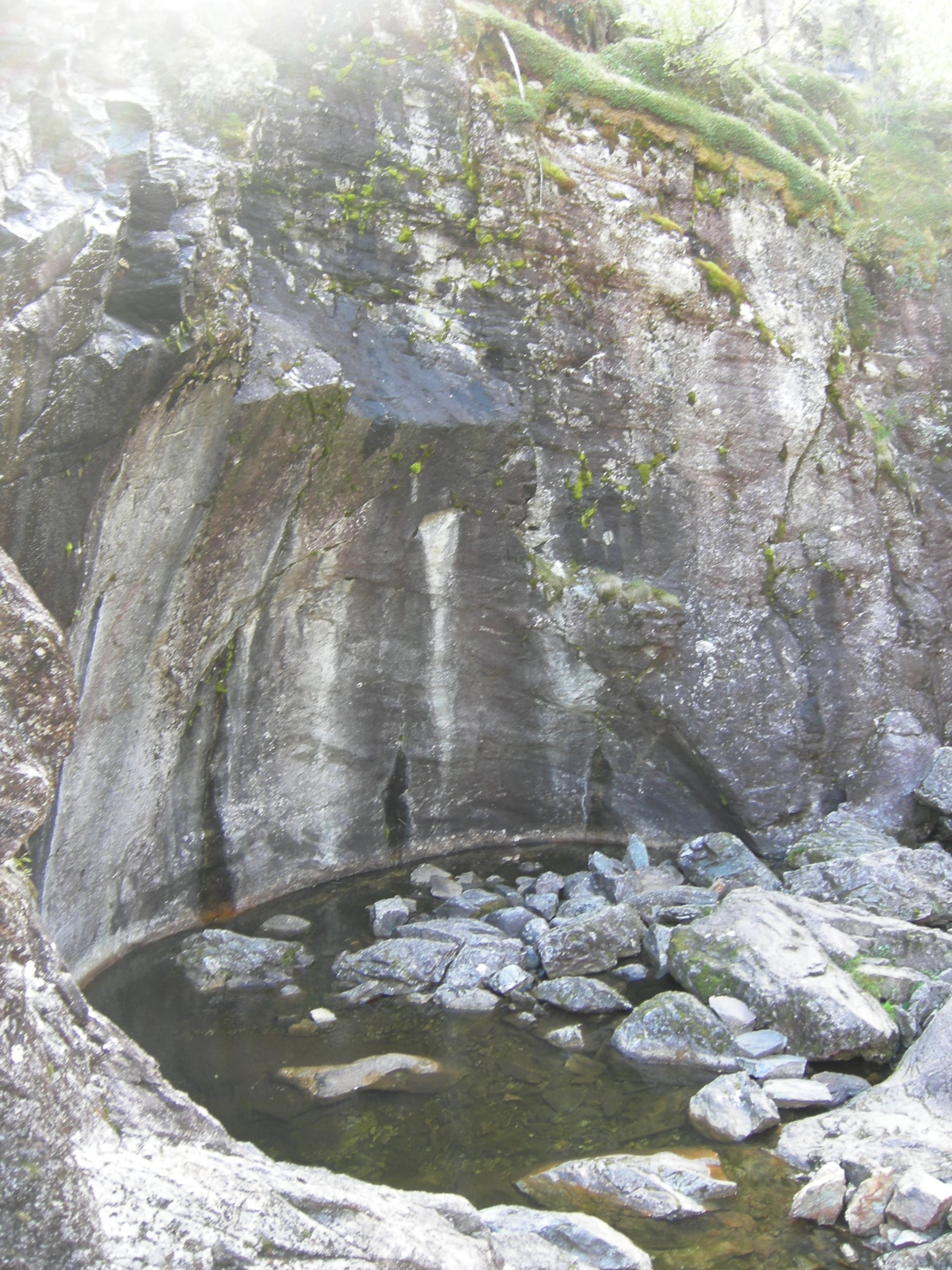 Grovere uorganiske substrater på land. Mosaikk av [9] kalkfattig normalt bergsubstrat med lav innstråling (og overgang til [17] intermediært normalt bergsubstrat med lav innstråling) og [15] kalkfattig bergsubstrat med lav innstråling under overheng (og overgang til [23] intermediært normalt bergsubstrat med lav innstråling under overheng) utgjør de glattskurte sidene i de store og til dels vassfylte jettegrytene i Helvete (Svatsum, Gausdal, Oppland).