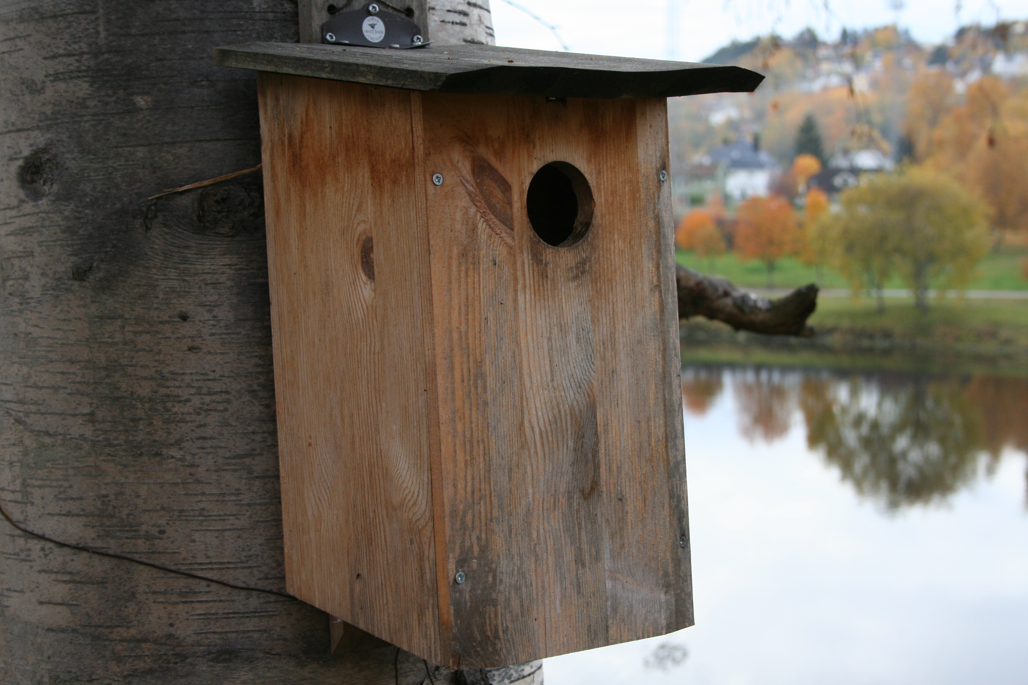 Ved-livsmedier [M2] sterkt modifisert ved utendørs, eksemplifisert ved ubehandlet fuglekasse ved Nidelva (Trondheim, Sør-Trøndelag).