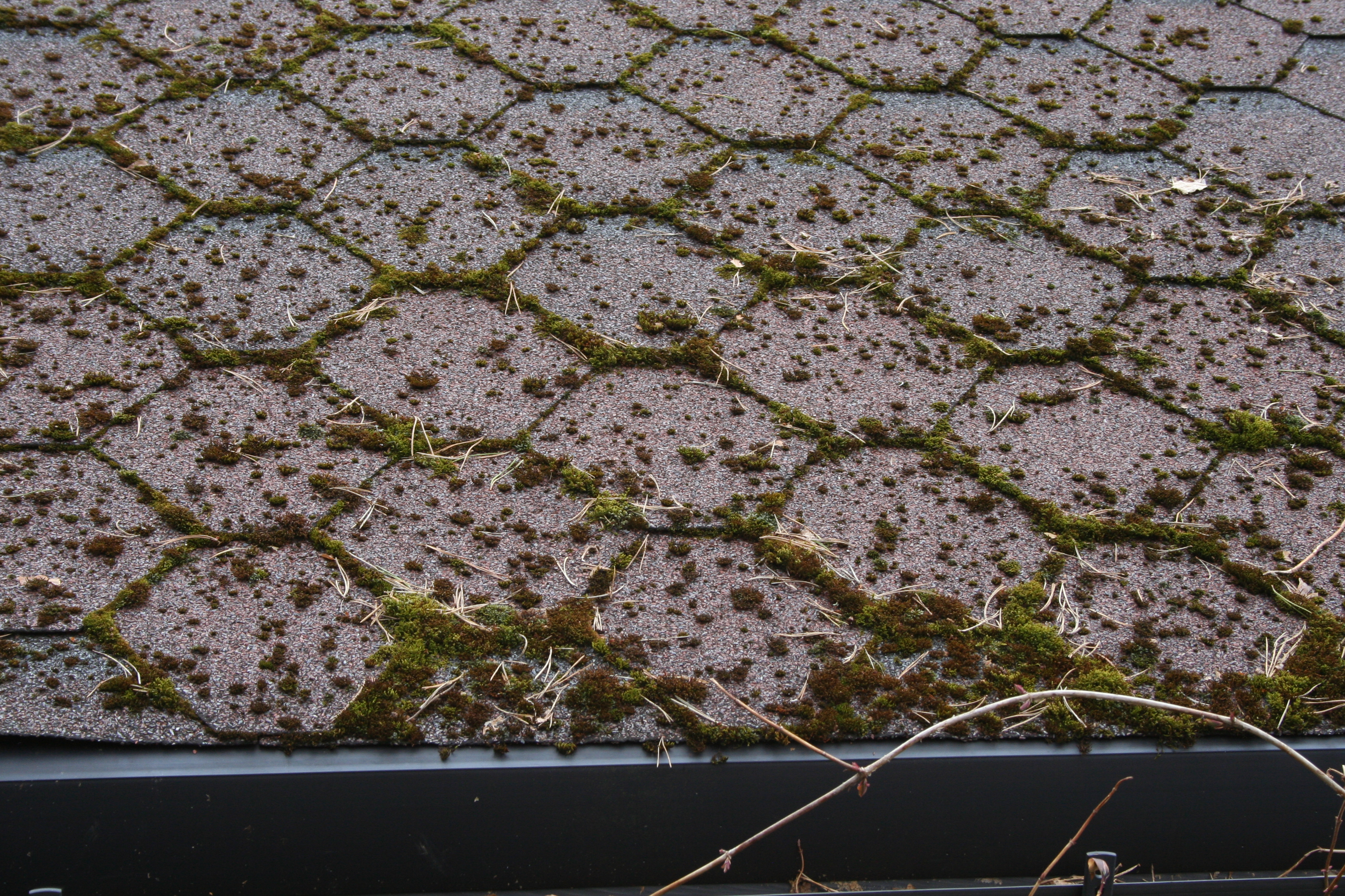 Syntetiske livsmedier på land, eksemplifisert ved takpapp (shingel) med påvekst av moser (Aksneset, Tingvoll, Møre og Romsdal).