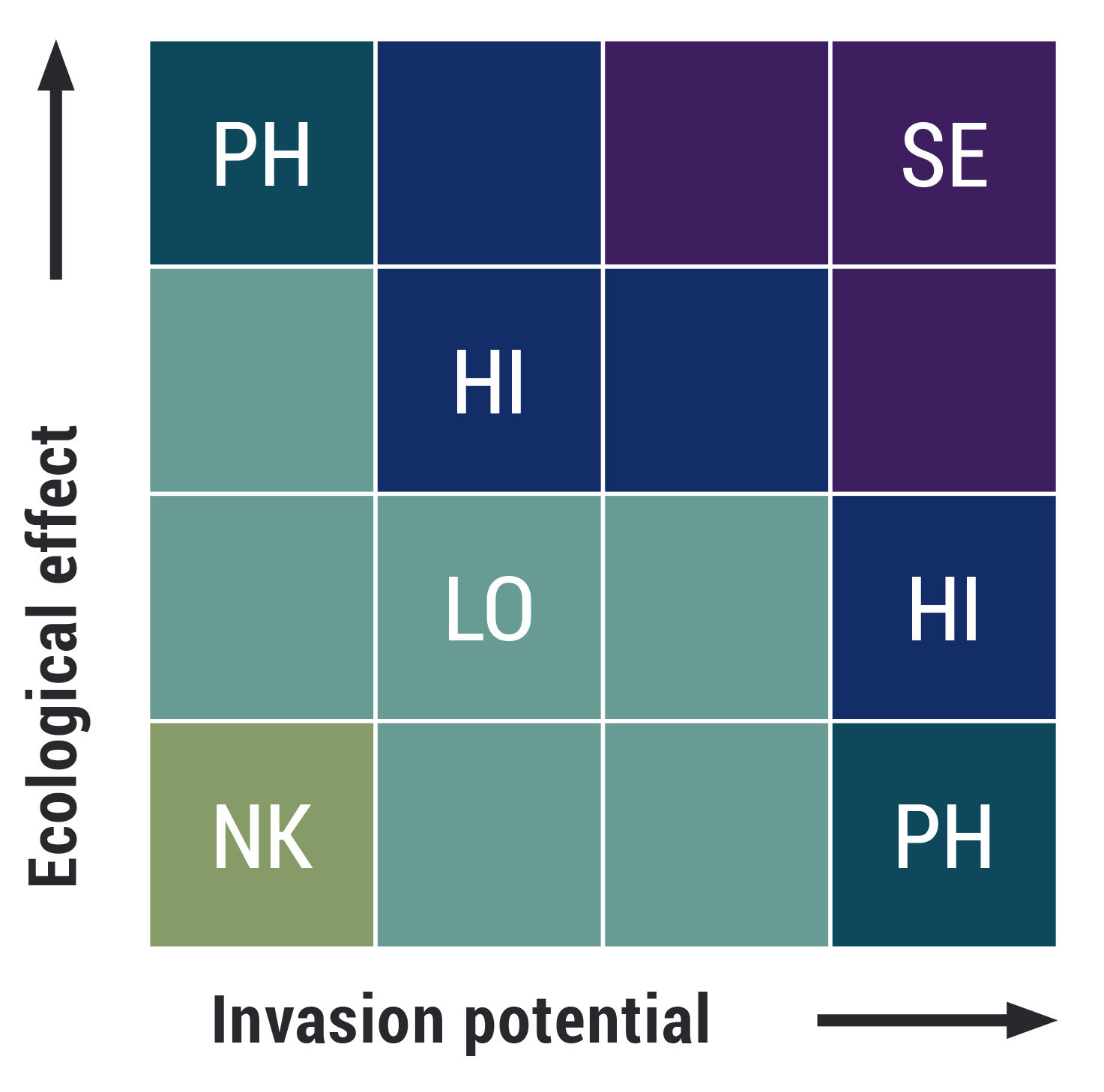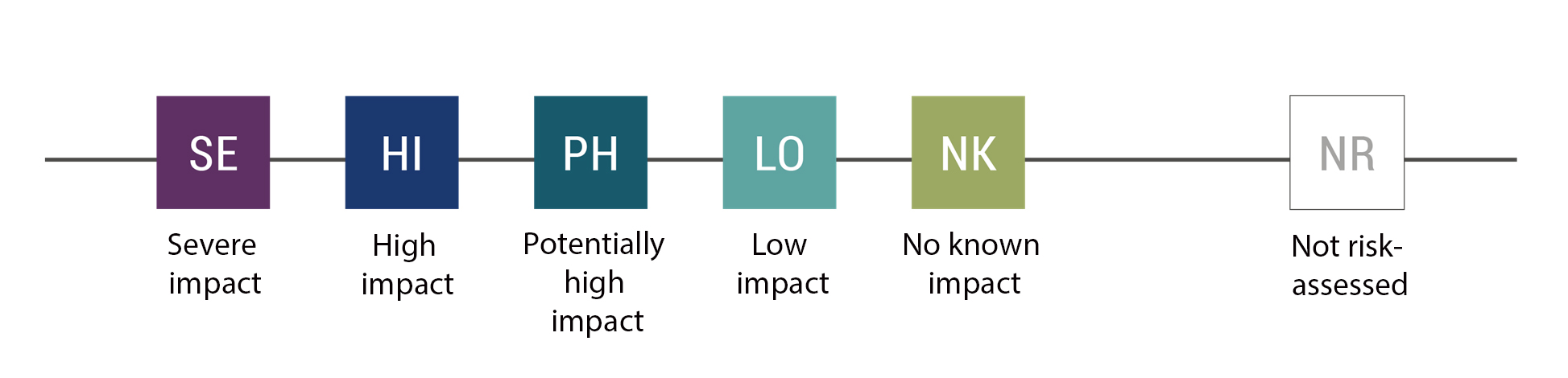 When assessing ecological risk, alien species are classified to one of the following categories: Severe impact SE; High impact HI; Potentially high impact; Low impact LO or No known risk NK. According to definitions and delimitations not all alien species are risk assessed. These species are named as Not risk-assessed NR.