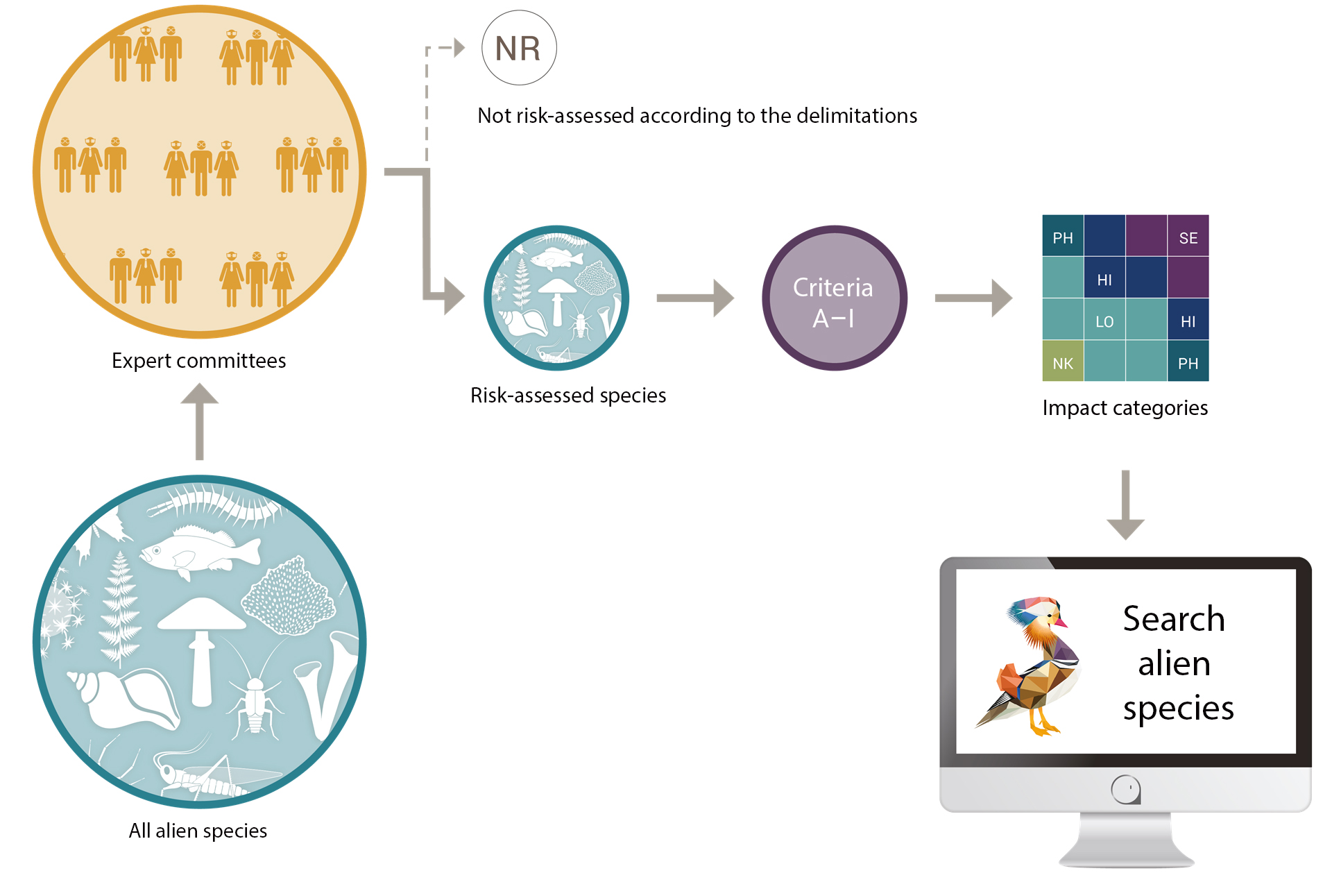 The experts initially decide which species should not be assessed, based on definitions and delimitations given in the publication Guidelines for the Generic Ecological Impact Assessment of Alien Species. Species that should be assessed are evaluated using nine criteria (A-I). The result of this evaluation process determines the impact category of the species.