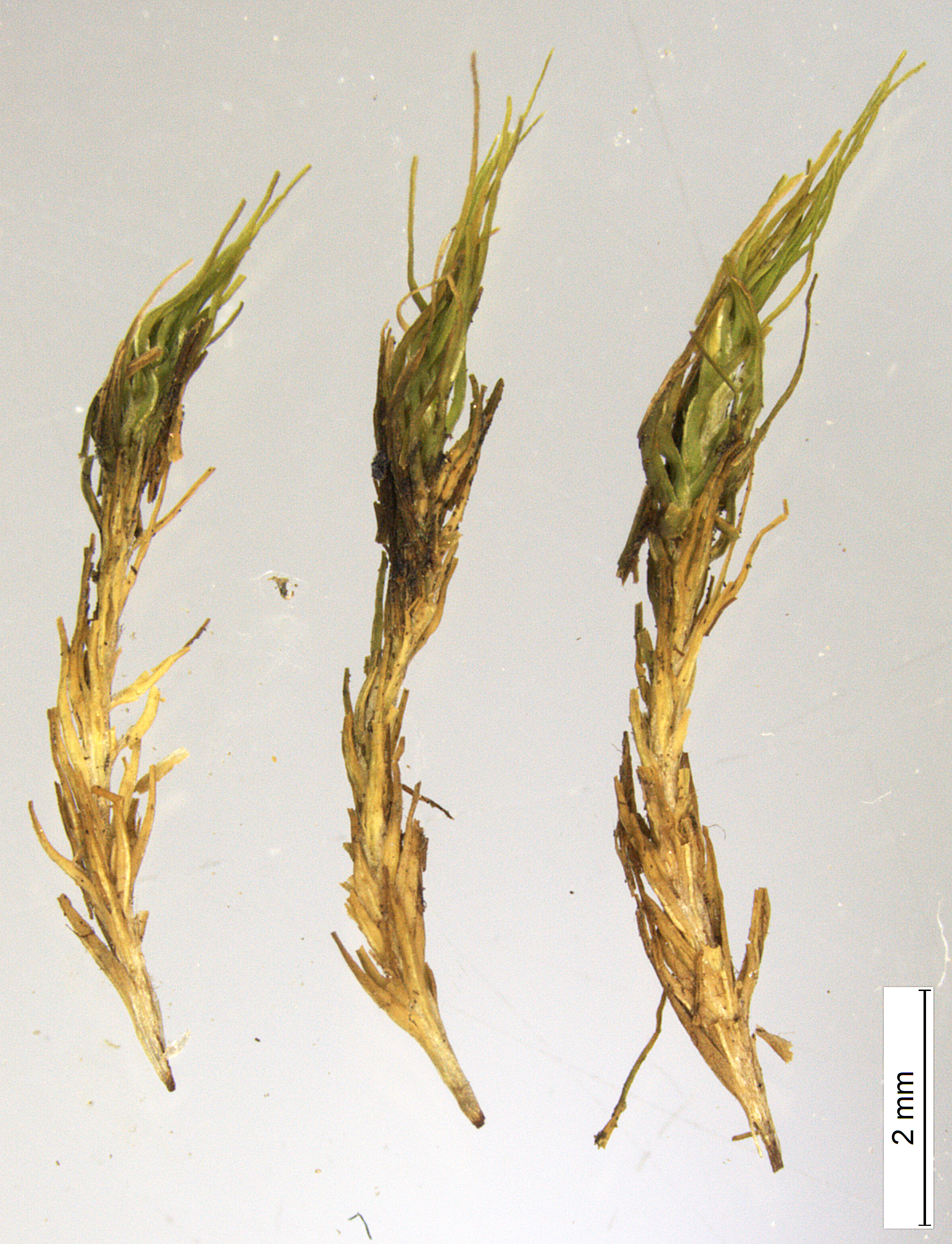 Tue med tørre skudd og delvis avbrekte bladspisser, legg merke til den lyse, nesten kvite bladbasisen.