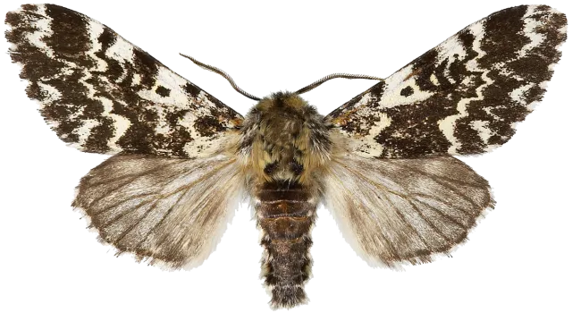 Larven lever først og fremst på @(furu), av og til på andre bartrær.