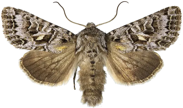 Larven lever på ulike urter, særlig @(kurvplanter).
