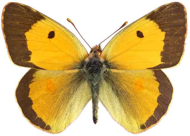 Begge vingepar har oransje grunnfarge. Langs ytterkanten av begge vingepar er det et bredt mørkebrunt felt som hos hunnen har gule flekker. Framvingen har en rund, brun midtflekk, og bakvingen har en uregelmessig oransjerød midtflekk. Hos begge kjønn har bakvingen grå bestøvning, men denne er kraftigere hos hunnen enn hos hannen.