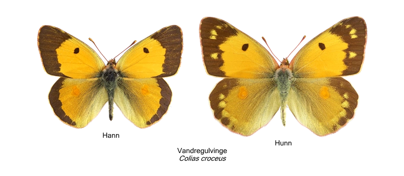 Begge vingepar har oransje grunnfarge. Langs ytterkanten av begge vingepar er det et bredt mørkebrunt felt som hos hunnen har gule flekker. Framvingen har en rund, brun midtflekk, og bakvingen har en uregelmessig oransjerød midtflekk. Hos begge kjønn har bakvingen grå bestøvning, men denne er kraftigere hos hunnen enn hos hannen.