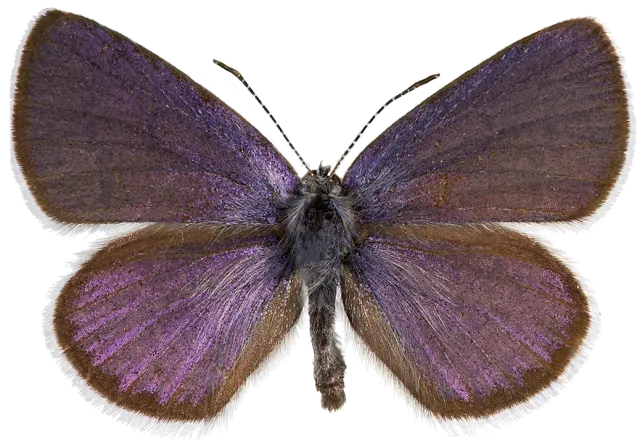 Hannens vingeoverside er mørk fiolettblå. Hunnen er brun med fiolettblått nærmest vingerota. Hunneksemplarer fra fjellet kan være rent brune. Undersiden er grå med svarte pletter innrammet i hvitt. Ved bakvingeundersidens bakhjørne er det en iøynefallende oransje flekk som utad er avgrenset av en skinnende lyseblå plett. Innenfor denne kan det være to tilsvarende mindre oransje og lyseblå pletter.