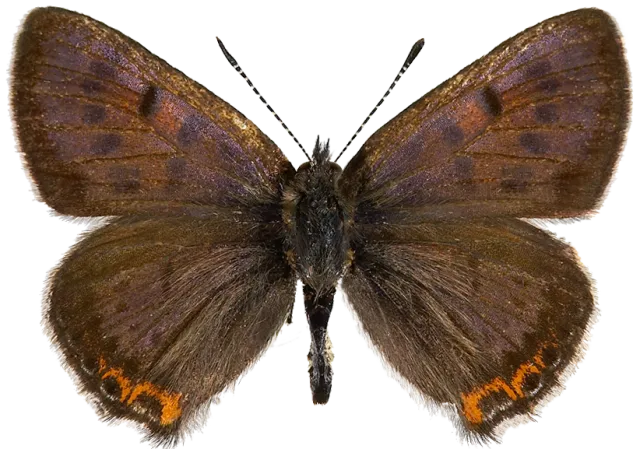 Hannens vingeoverside er brun med svarte pletter og kraftig fiolett metallglans. Bakkanten av bakvingen har oransje halvmåner over en smal, lyseblå linje. De oransje plettene kan imidlertid være redusert. Hunnens vingeoverside mangler oftest hannens fiolette metallglans, men har rader med blå og oransje pletter. Ofte danner de oransje plettene et sammenhengende bånd på framvingen. Framvingens underside er oransje med gulringede pletter. Bakvingeundersiden er brungrå med svarte pleter kantet med hvitt, og med et framtredende oransje bånd langs ytterkanten.