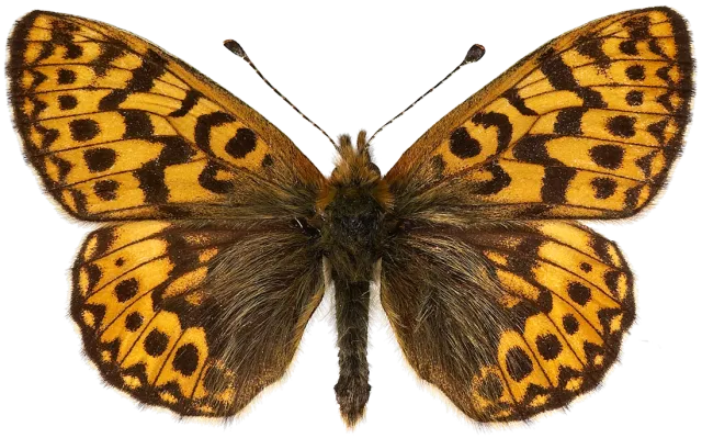 Vingeoversiden er relativt lyst gulbrun med et grovtegnet mønster av svarte flekker. Bakvingens underside har et broket mønster i hovedsaklig brunt og sølvhvitt med kraftige svarte streker. De store flekkene som danner et bånd midt på vingen er for største delen fylt med rustrødt, og er utad kantet med grove svarte vinkler i siksak-mønster. Undersidemønsteret er mer broket enn hos våre andre små @(perlemorvinger).