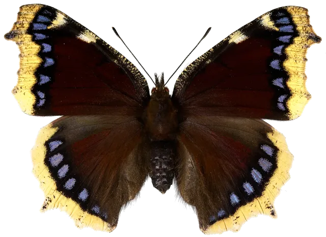Vingeoversiden er dyp fløyelsbrun. Begge vingepar har et bredt gult kantbånd, og innenfor dette en rad skinnende blå pletter mot svart bakgrunn. Framvingens framkant har ytterligere to gule flekker. De gule tegningene blekner til nesten hvitt etter overvintringen. Undersiden er mørkebrun med fine svarte streker, og de gule oversidetegningene går igjen som blekt gulhvite på undersiden. Arten kan ikke forveksles med andre arter.
