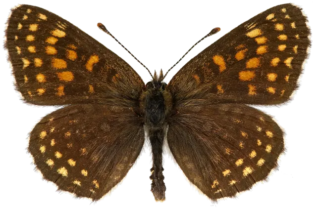 Dette er den mørkeste @(rutevingen). Vingeoversidens grunnfarge er oransje, men de svarte ribbene og tverrbåndene er så kraftig utviklet at oversiden framtrer nærmest svart. De ytre av oversidens lyse flekker er gulhvite, lenger inn på vingen er de gulbrune. På bakvingeundersiden består det ytterste båndet av grågule eller oransjegule flekker mens det nest ytterste har hvitgule flekker. Det er dermed tydelig fargekontrast mellom de to ytterste båndene. Det neste båndet består av okerfargede flekker med brune buer, noen ganger med brune eller svarte punkter i buene. Arten ligner @(marimjellerutevinge), men denne er gjennomgående lysere på vingenes overside, og de to ytre båndene på bakvingens underside har samme gulhvite farge. I det neste båndet er flekkene uten brune buer, men ofte med en rødlig midtplett.