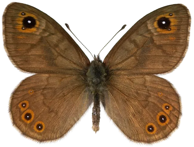 Vingeoversiden er gråbrun med okergule felter i ytre del av vingene. Det er én stor øyeflekk på framvingen og tre i et bånd på bakvingen. I tillegg er det ofte flere ”mini-øyeflekker” i tilknytning til de store. Framvingens overside har tre utydelige mørke tverrlinjer som går fra framvingekanten inn mot midten av vingen. Hannens framvinger er spissere med mindre omfattende okergule tegninger enn hunnens, og har dessuten en utydelig skråstripe med gråaktige duftskjell. Arten er svært lik @(klipperingvinge), men kan skilles på de tre utydelige tverrstripene på framvingen og på sin overveiende mindre størrelse. Den mørke skrå linjen innenfor øyeflekken på framvingen har en liten tann under øyeflekken. Hos @(klipperingvinge) går denne linjen nesten rettlinjet mot vingens bakhjørne. De to artene har ulik (men overlappende) flyvetid.